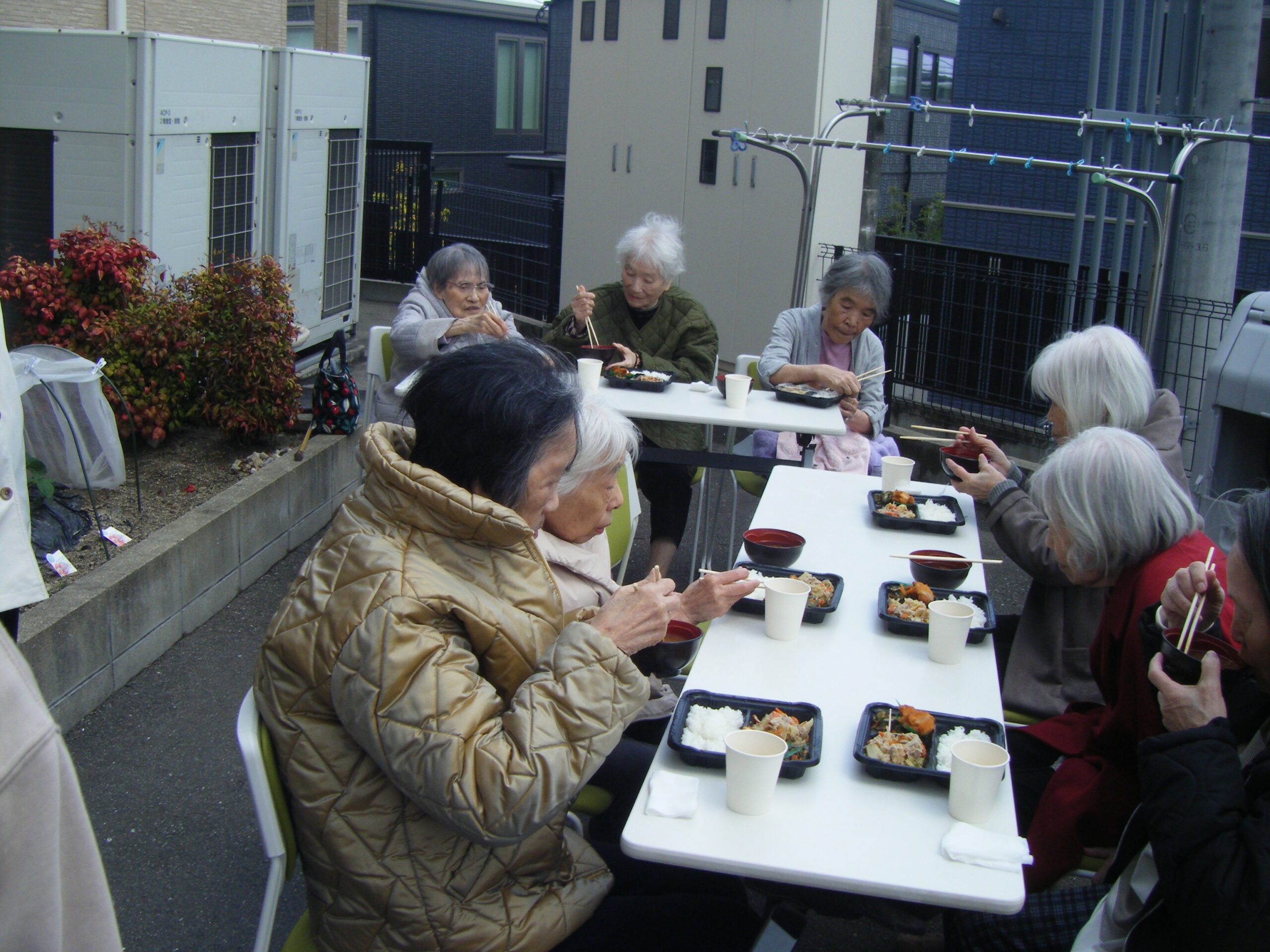 昼食は心の丘駐車場の花壇の前で