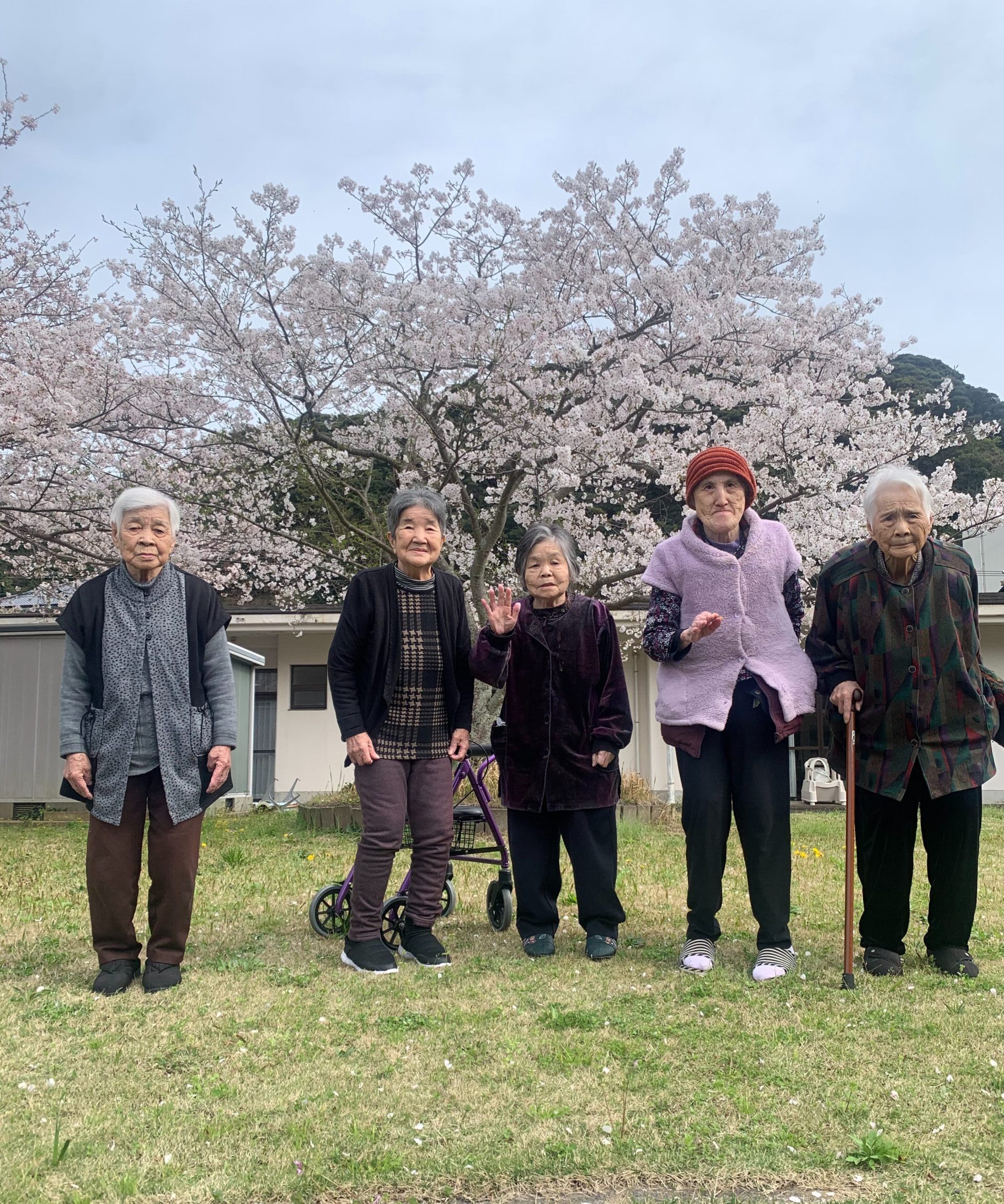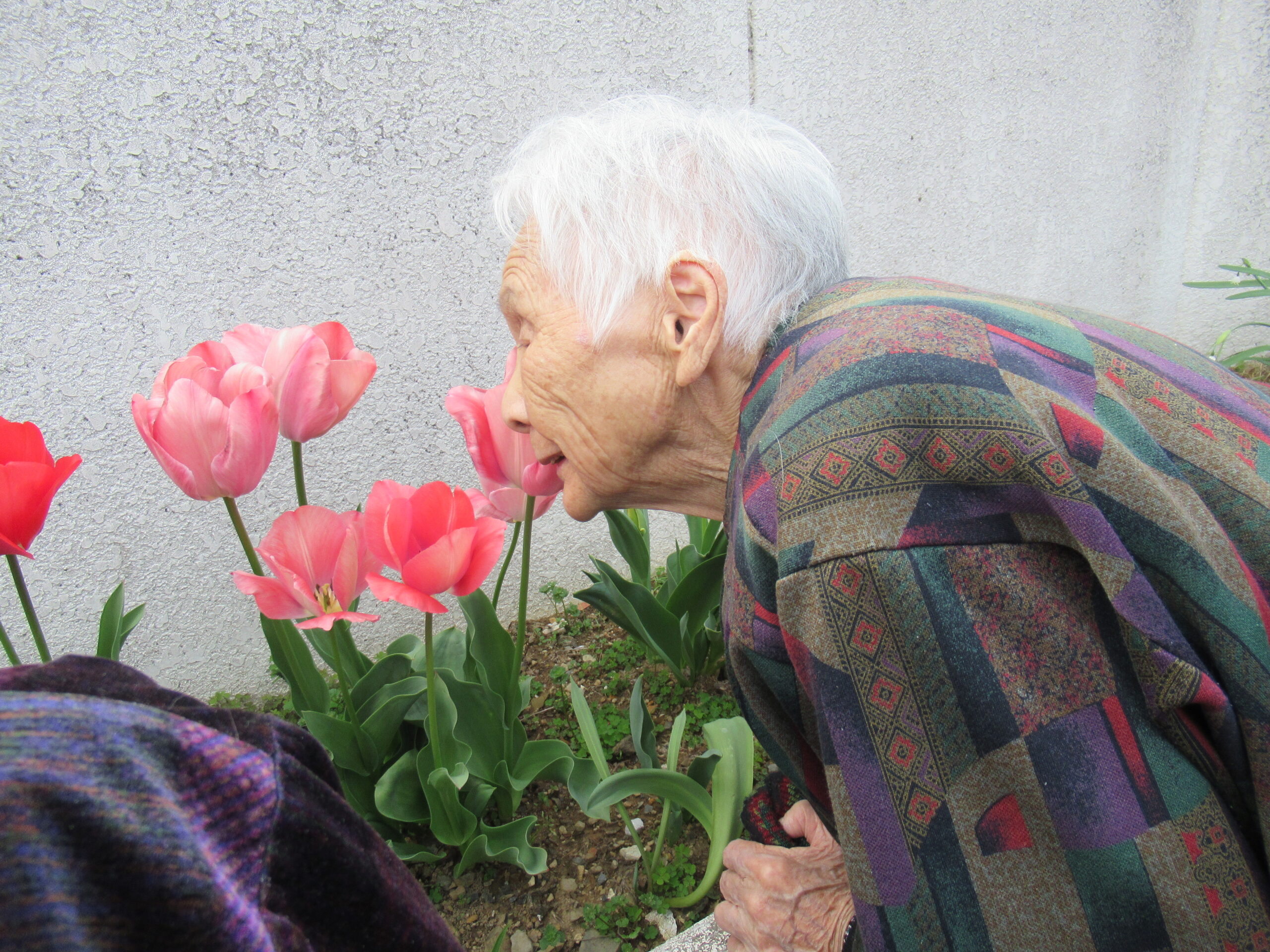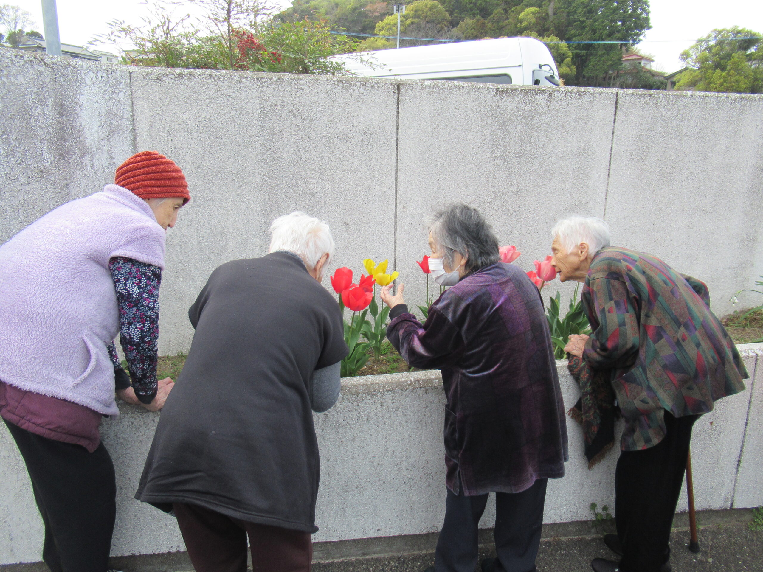 ポカポカ陽気に誘われて ちょこっと散歩に・・・☀かわいいお花を前に 会話が弾みます♪  「あ~ いい匂いがするよ!」最後に みなさんで ハイッ!チーズ✌施設内にある 桜の下でも❀