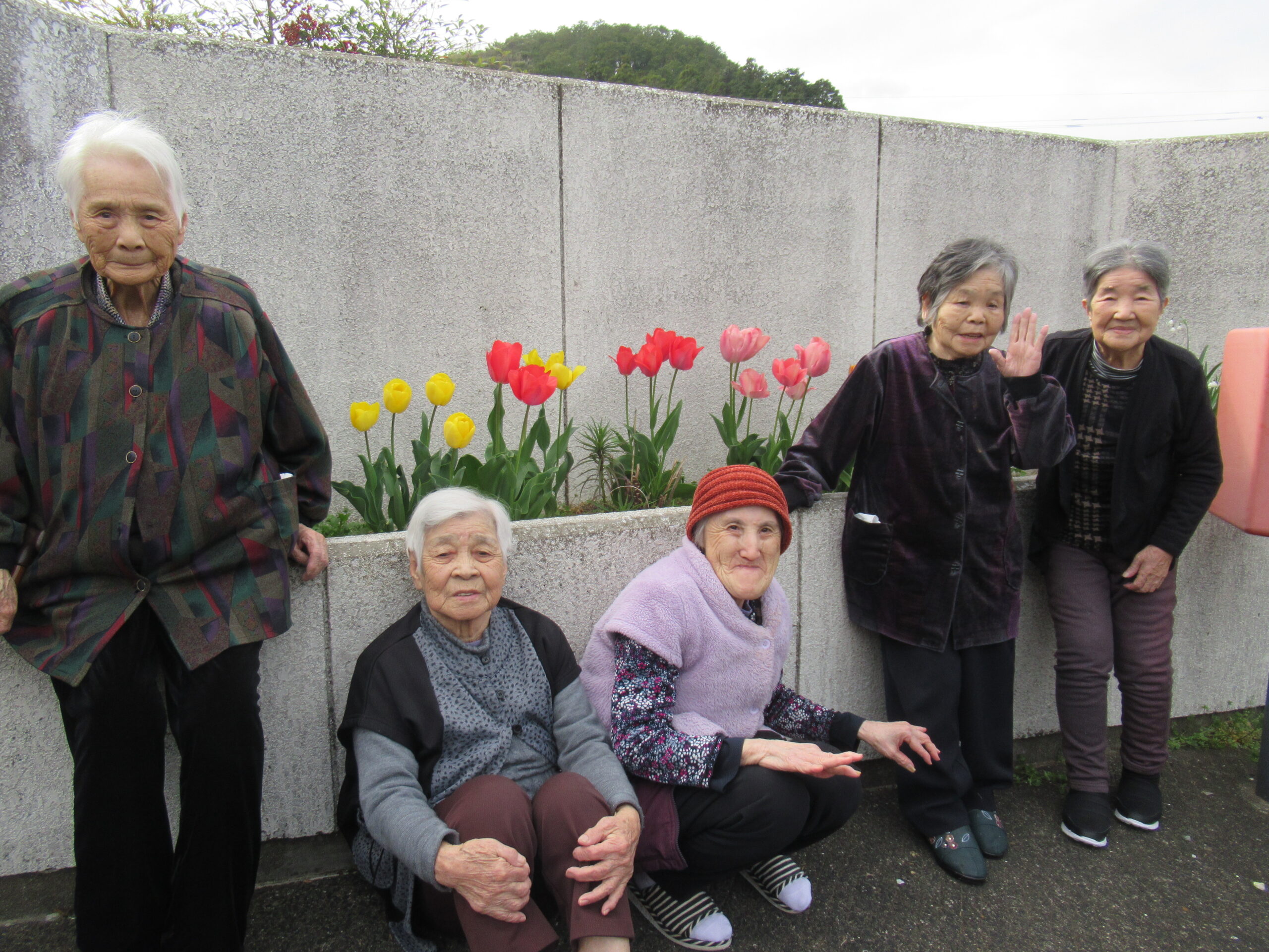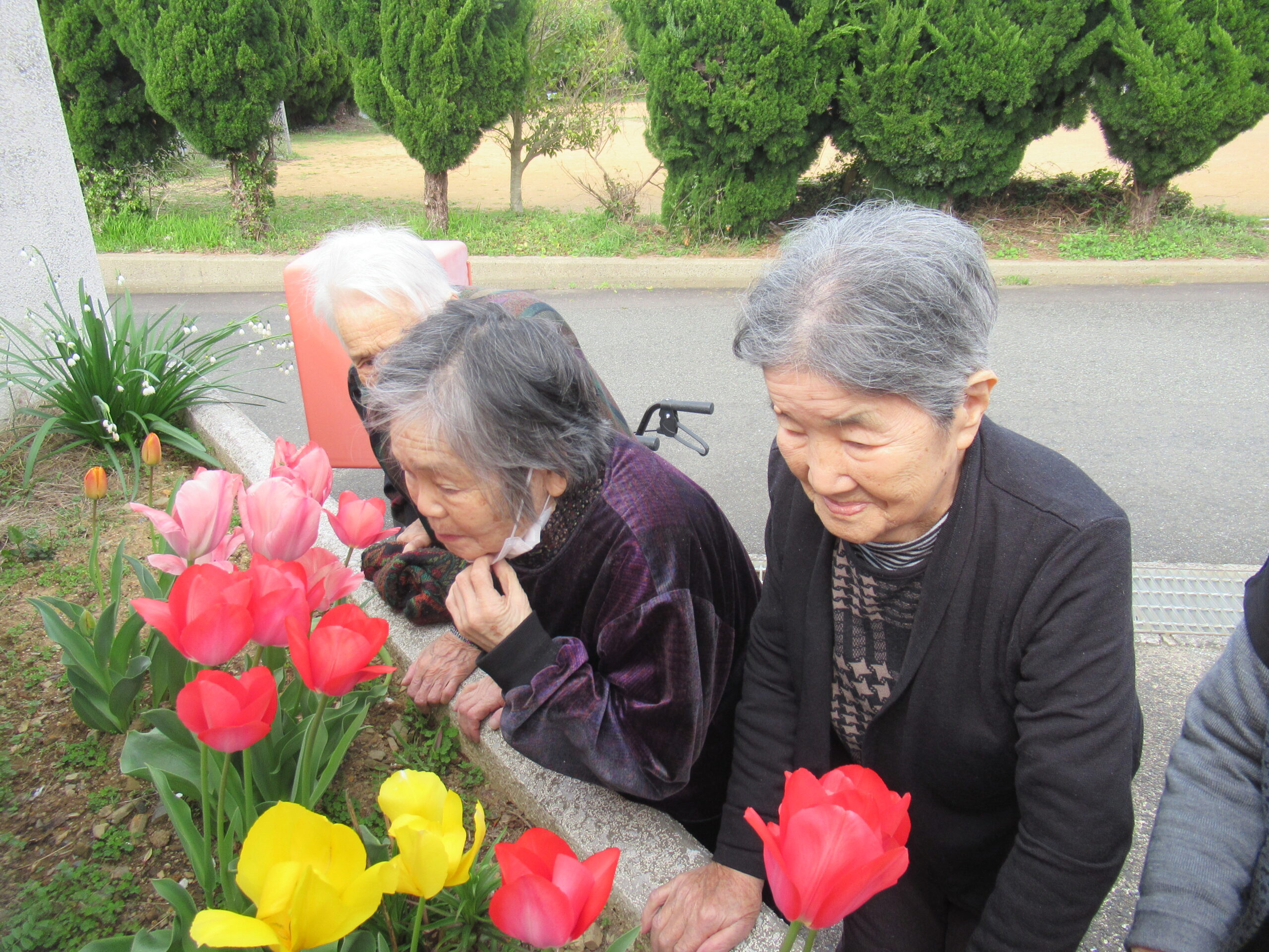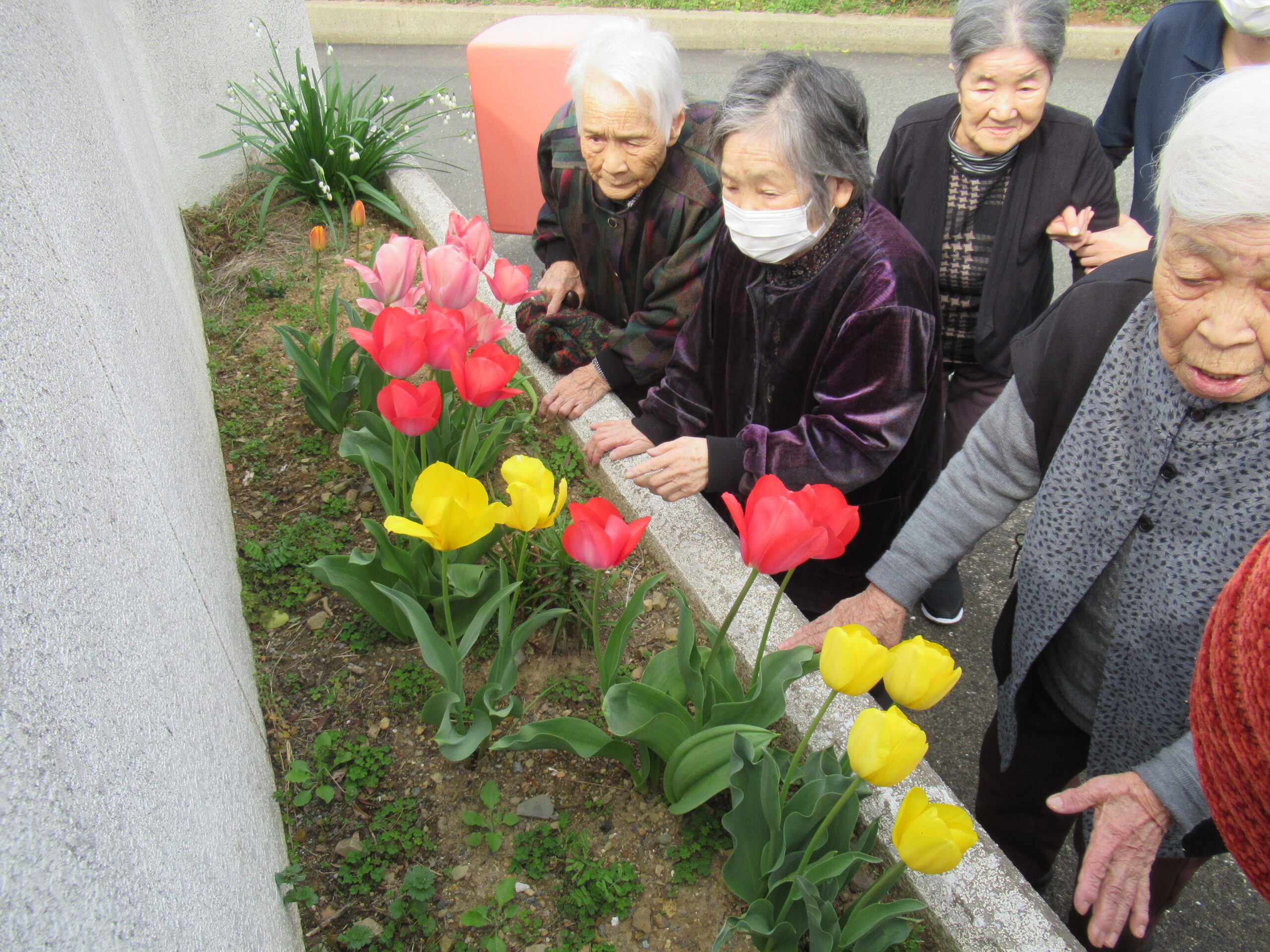 ポカポカ陽気に誘われて ちょこっと散歩に・・・☀かわいいお花を前に 会話が弾みます♪  「あ~ いい匂いがするよ!」最後に みなさんで ハイッ!チーズ✌施設内にある 桜の下でも❀