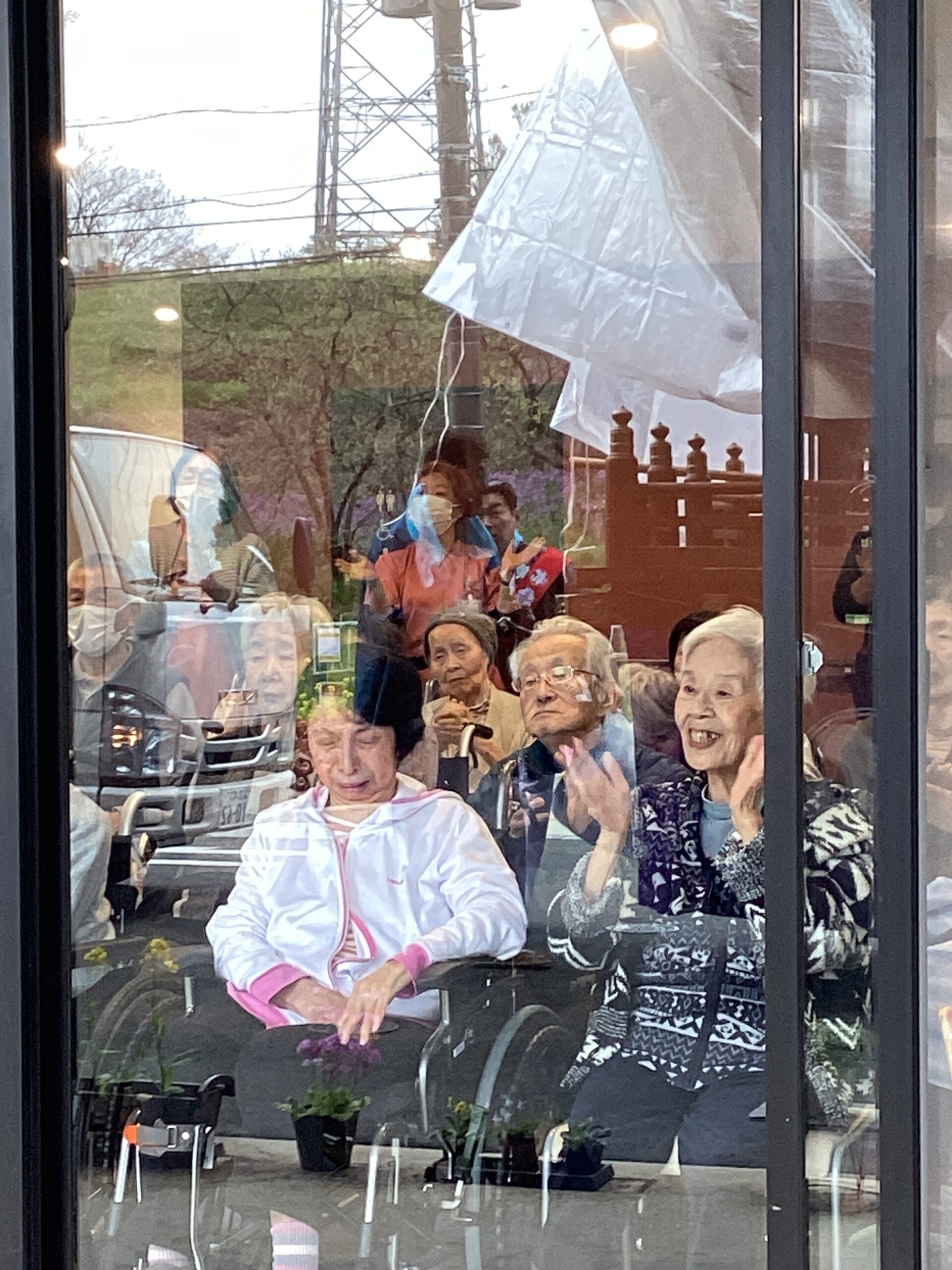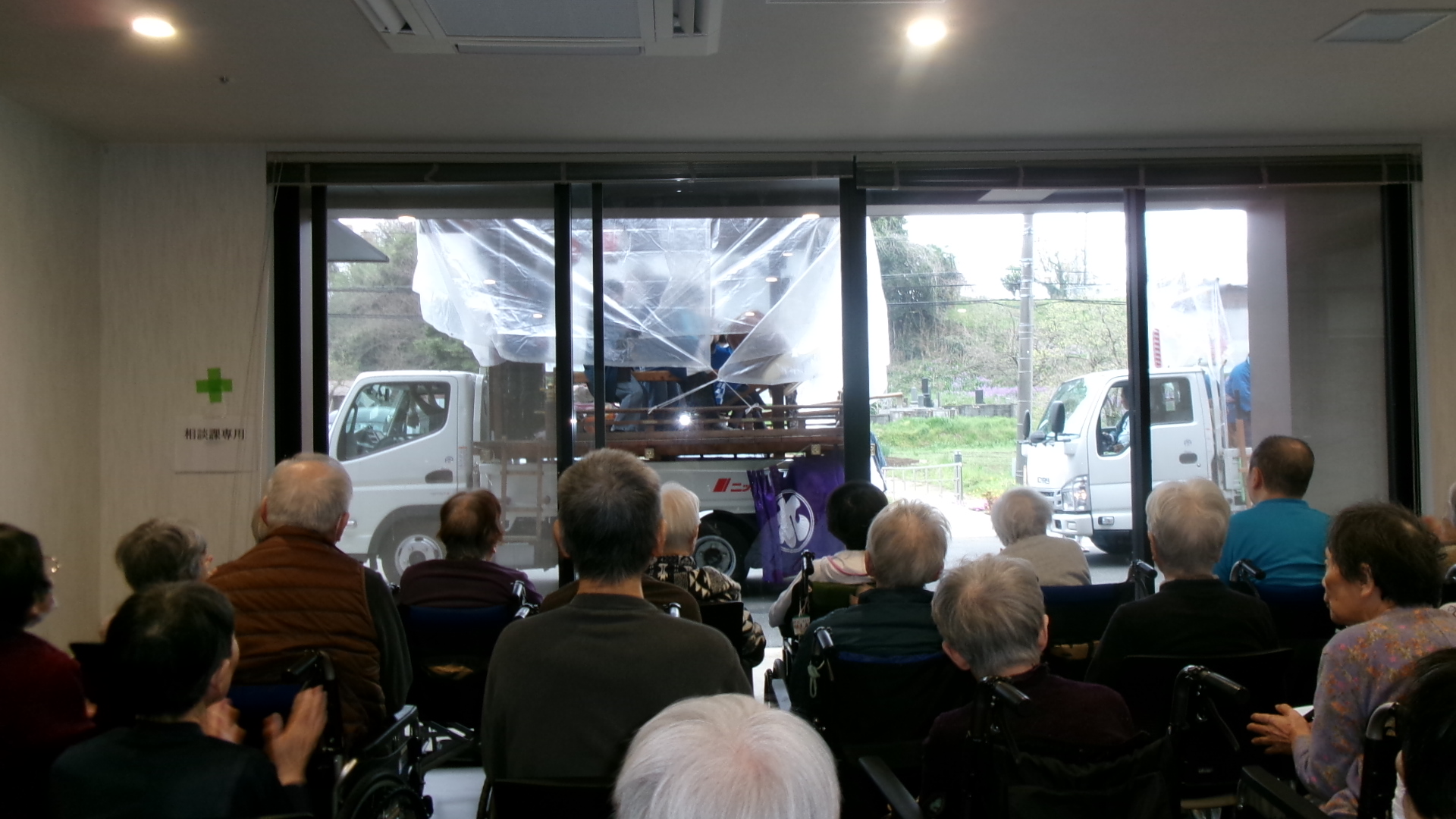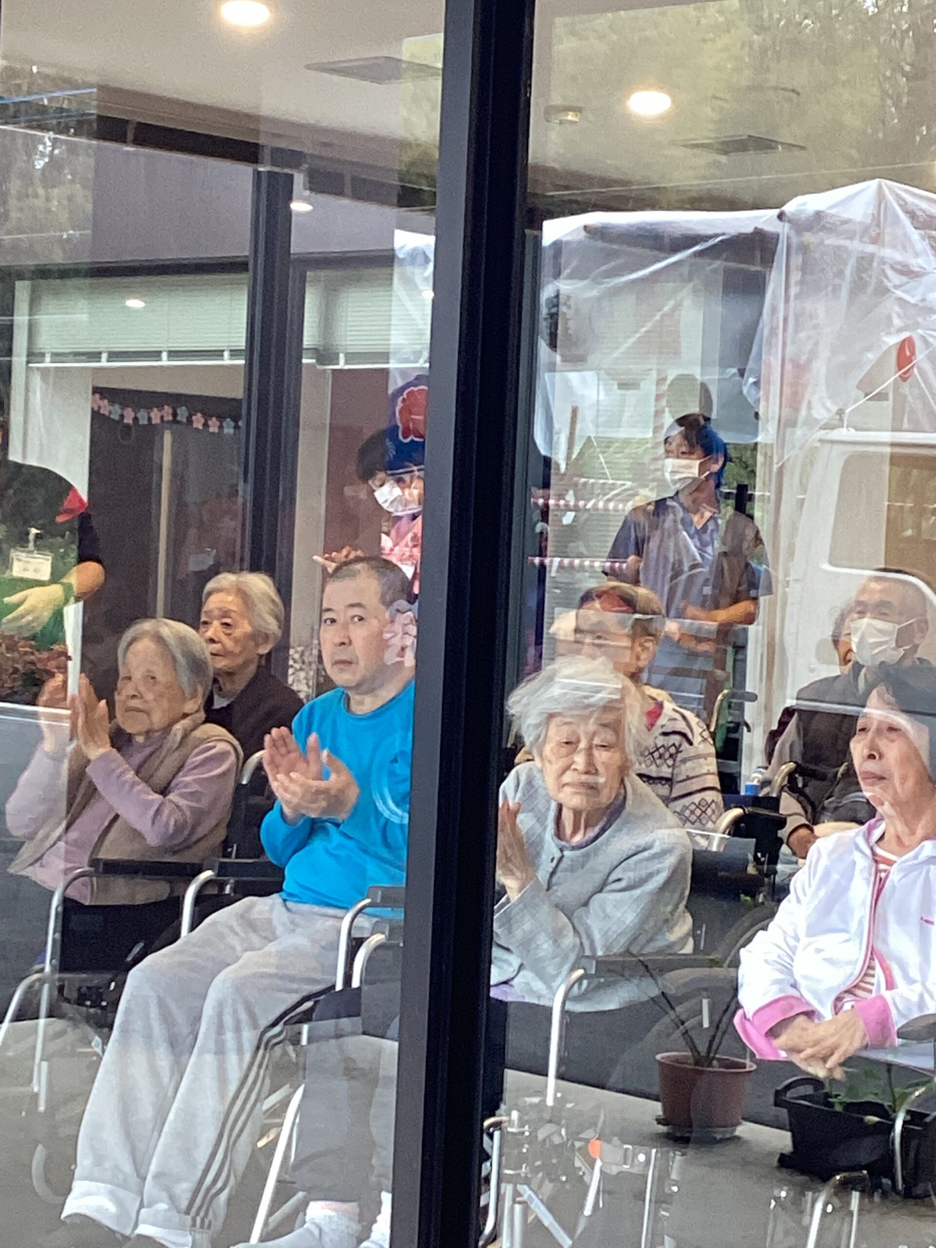 施設の駐車場に入って太鼓を叩いて下さるとのことで、是非ご入居者様にも外で見て頂きたい‼️と思いましたが、当日は雨☔予報だったので、外に出ることは出来ないので1階の地域交流スペースにて、ご入居者様に見て頂くことにしました☺️