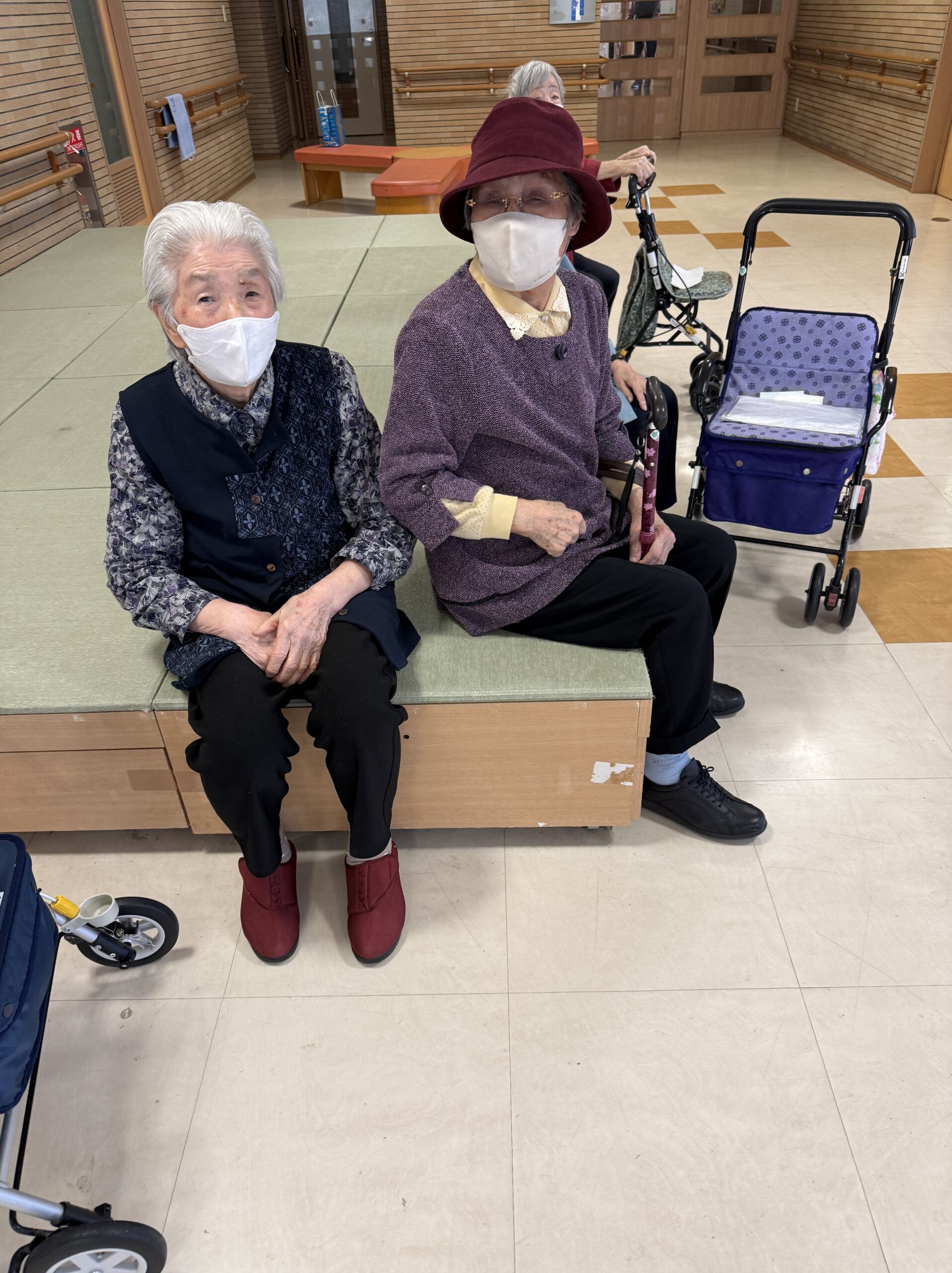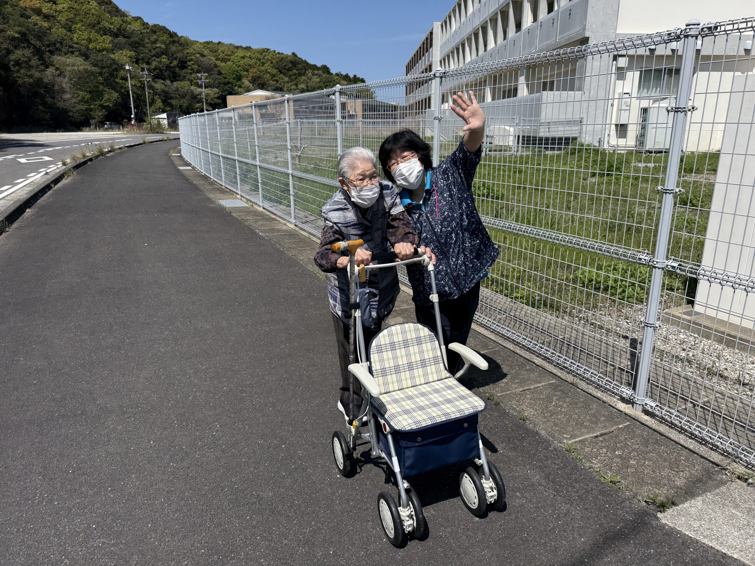 快晴の中🌞歩いていく人、車椅子で行く人、車での送迎の人(*^^*)