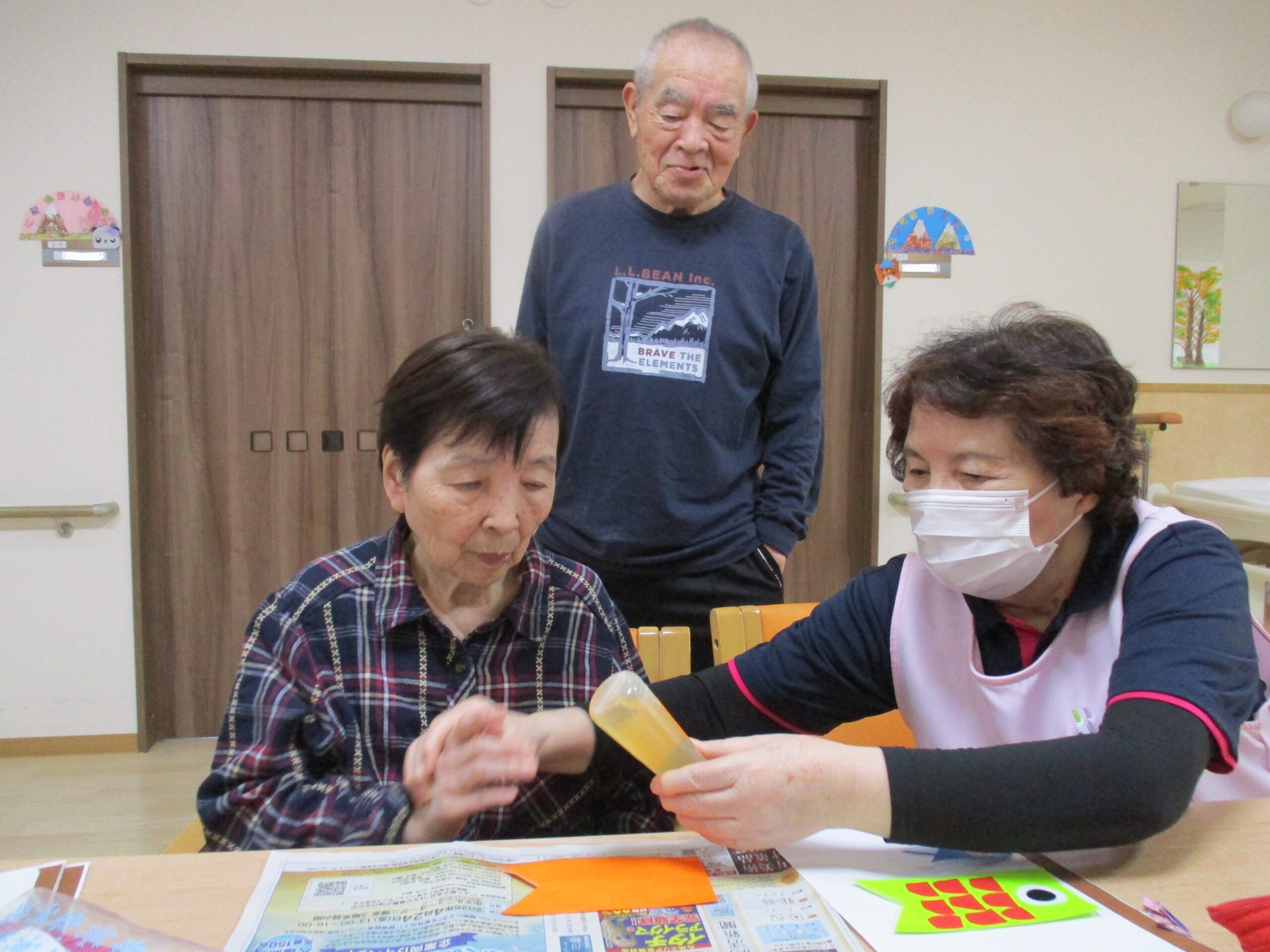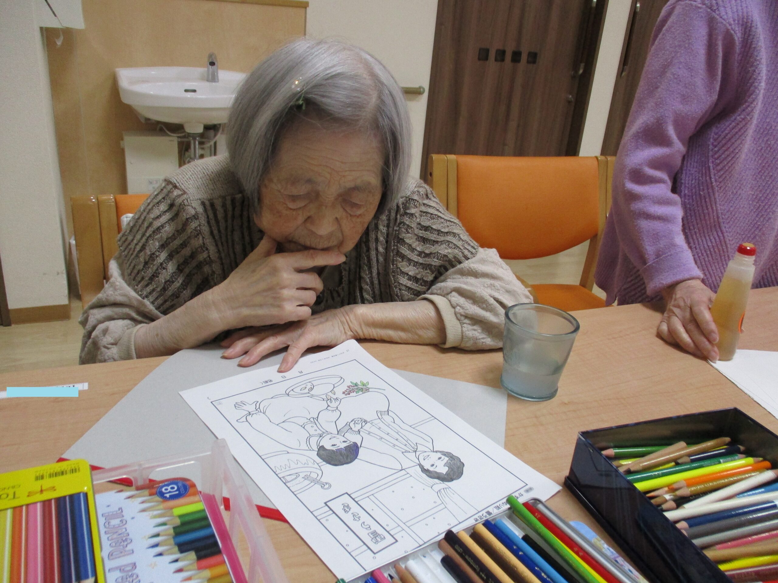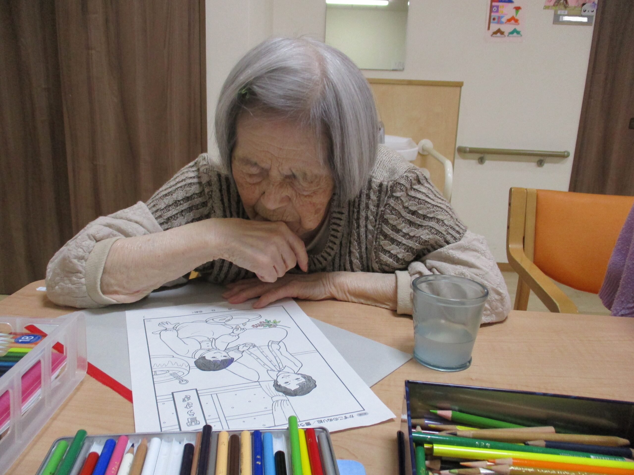 ぬりえ中のご入居者さま。なにやら深刻な雰囲気🧐
