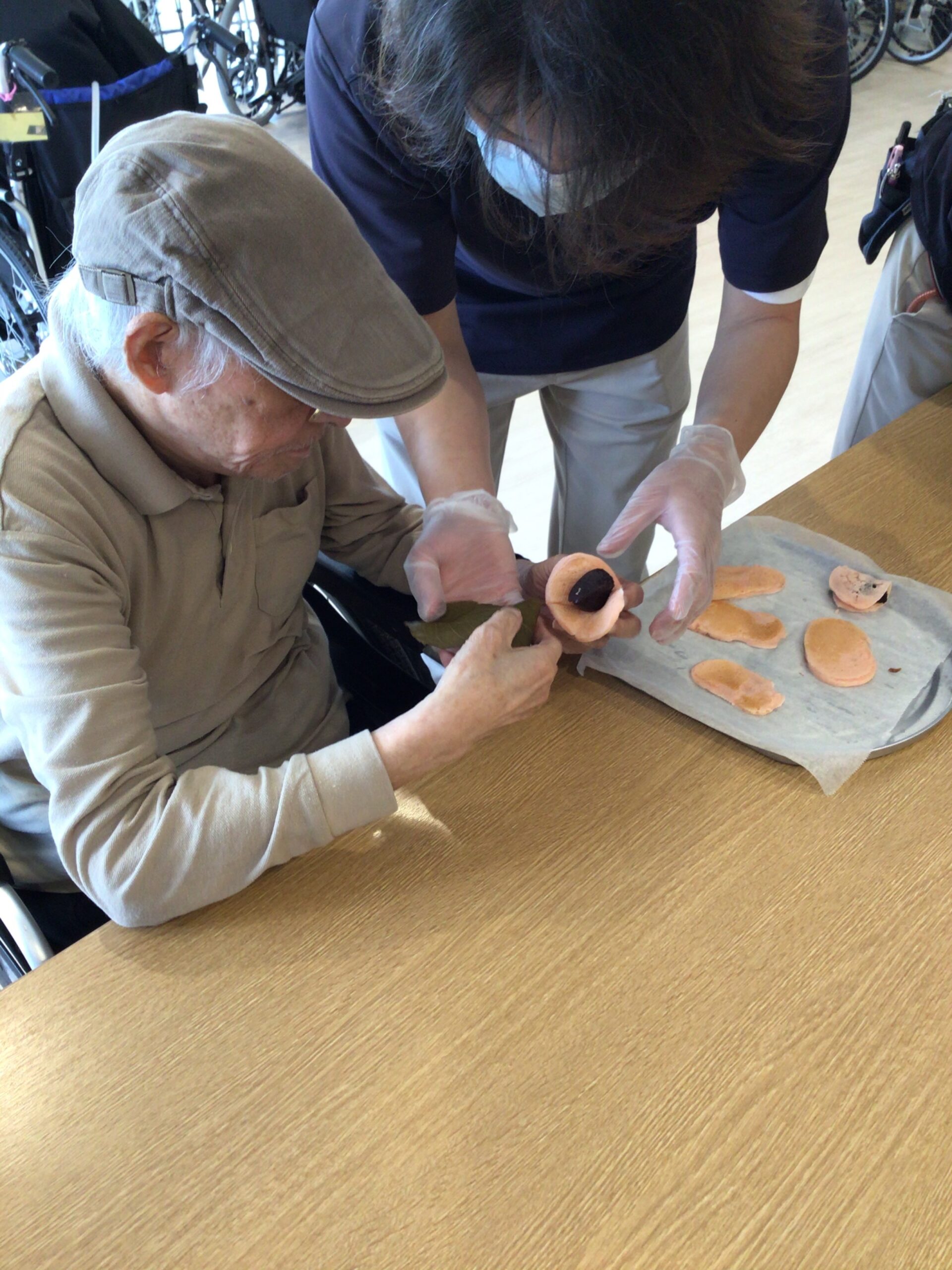 桜餅を作りますとお伝えした時から「さくらもち!食べたい」ととても興味を示されていたT様。あんこをたくさん取り、職員と一緒に包む様子がみられました。「あんこがはみ出ちゃってうまくできないや」と嬉しそうに話されました。