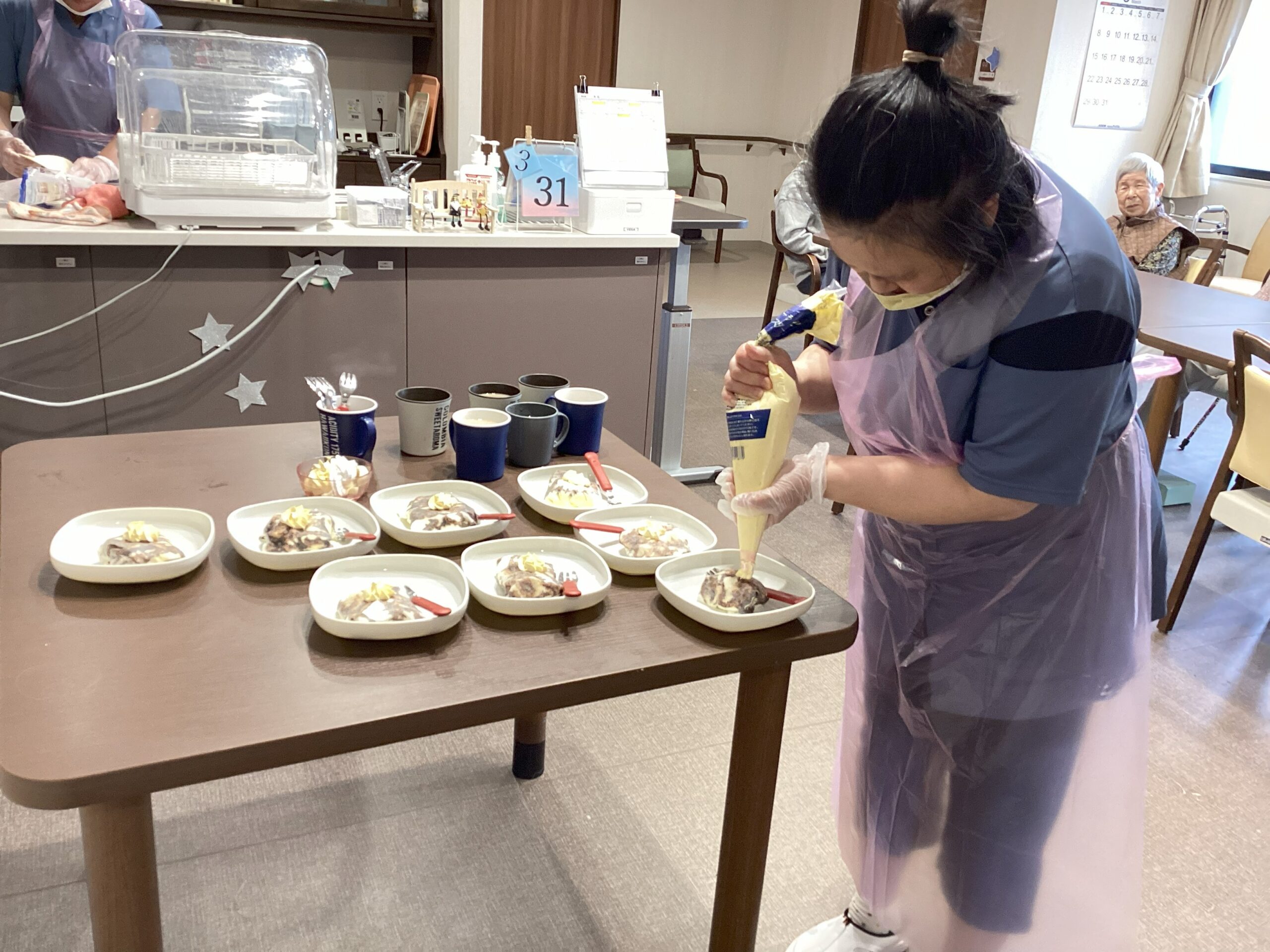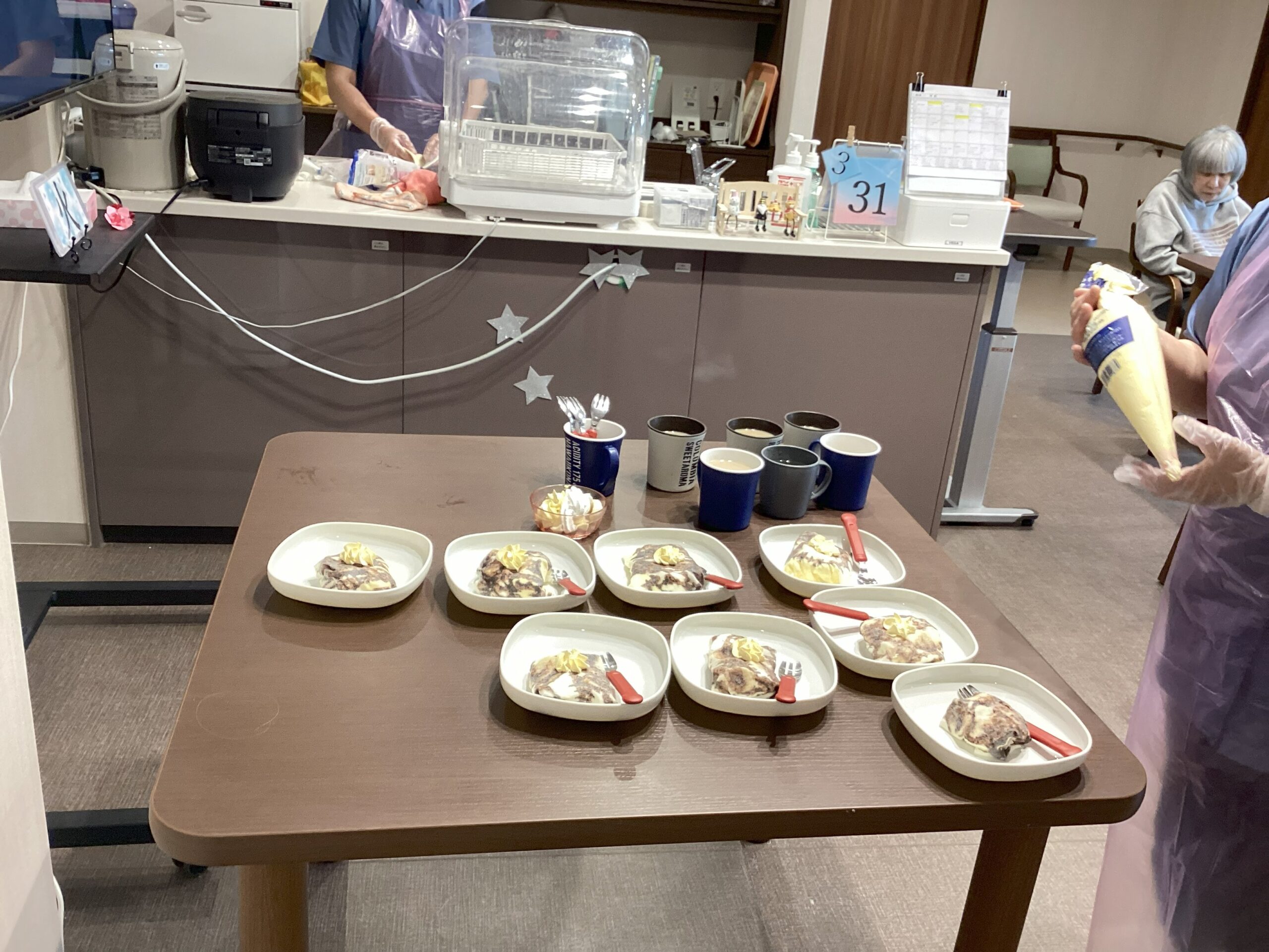 レクリエーション中に別の職員は、おやつのクレープ作りを🌟