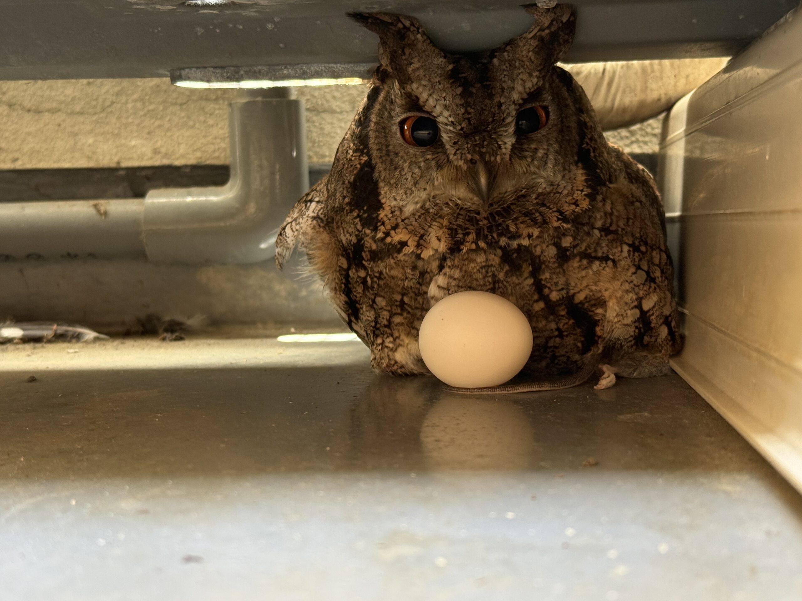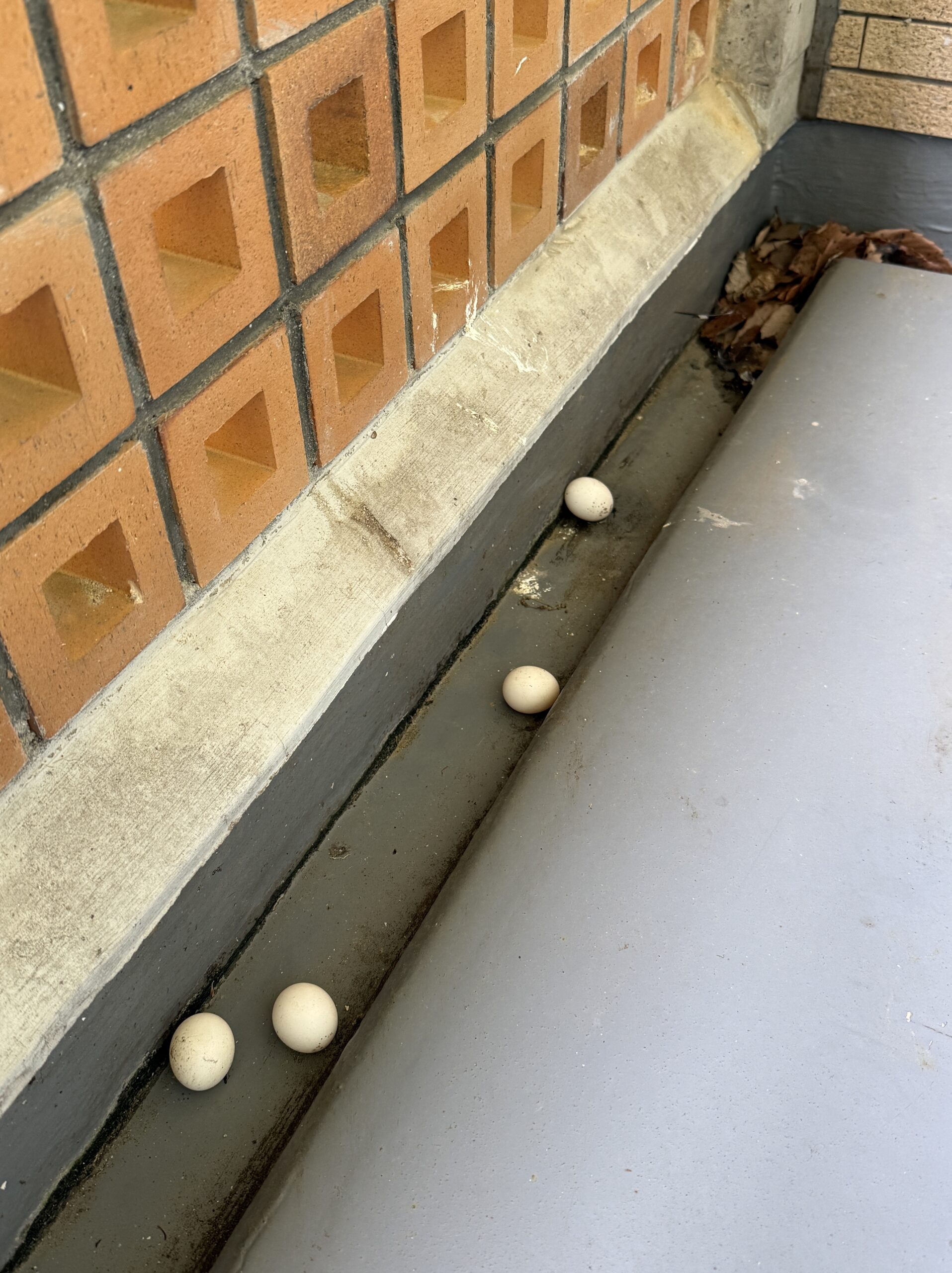エアコンの下に昼間はお母さんがいますがベランダが傾斜の為、たまごが転がっていきます(´;ω;`)