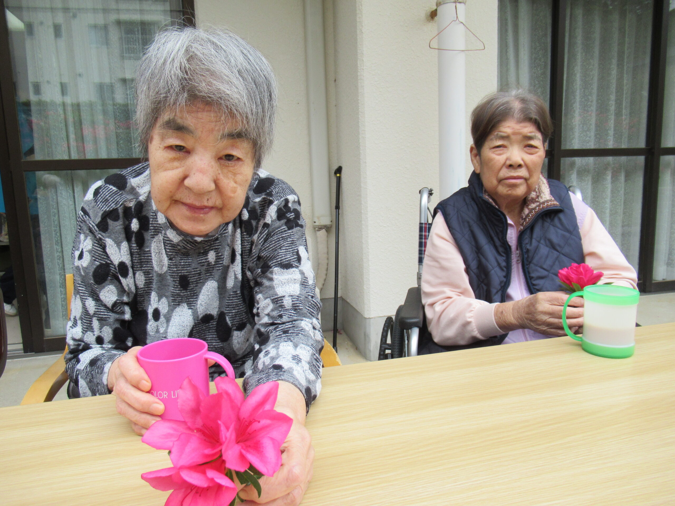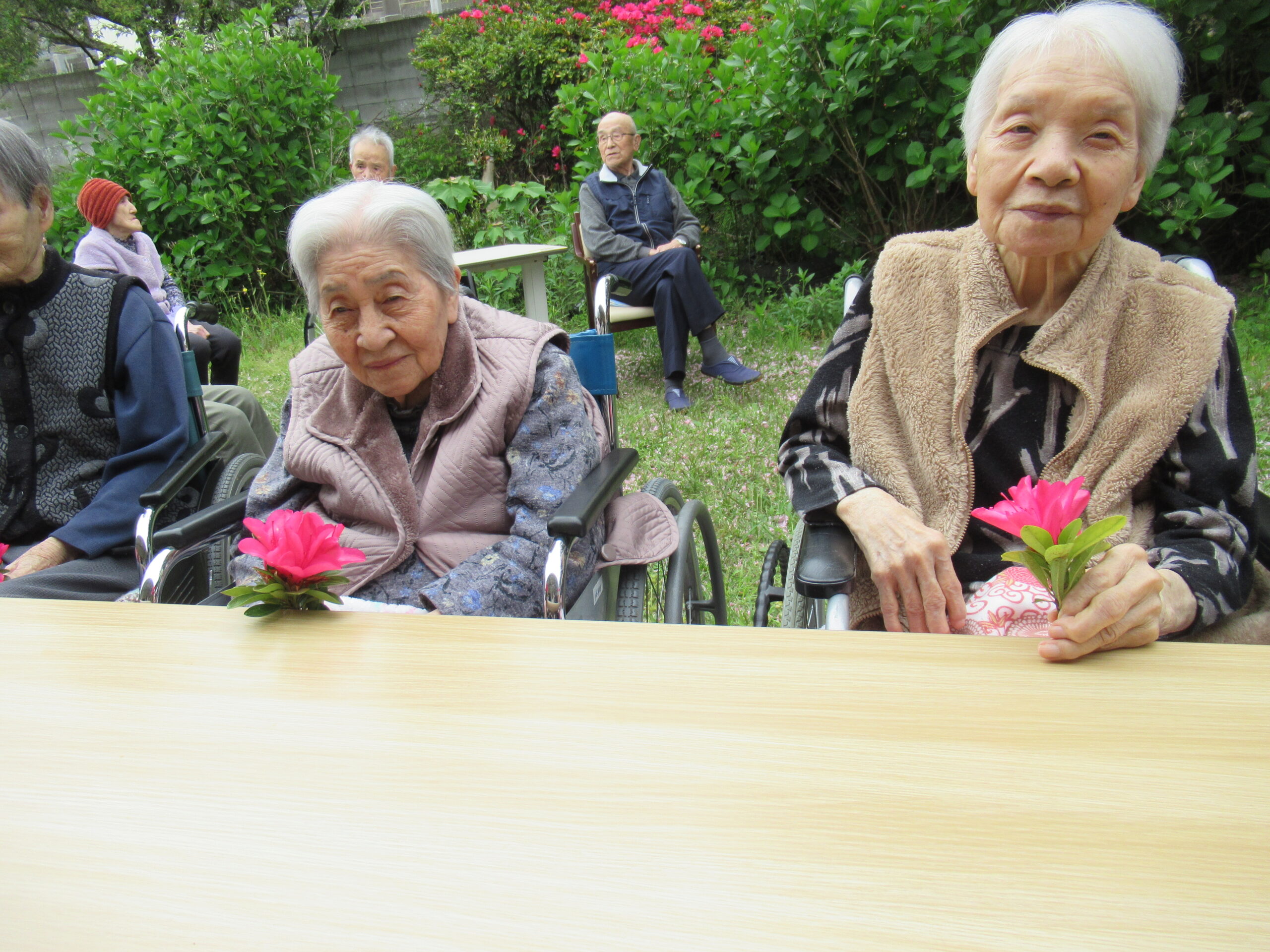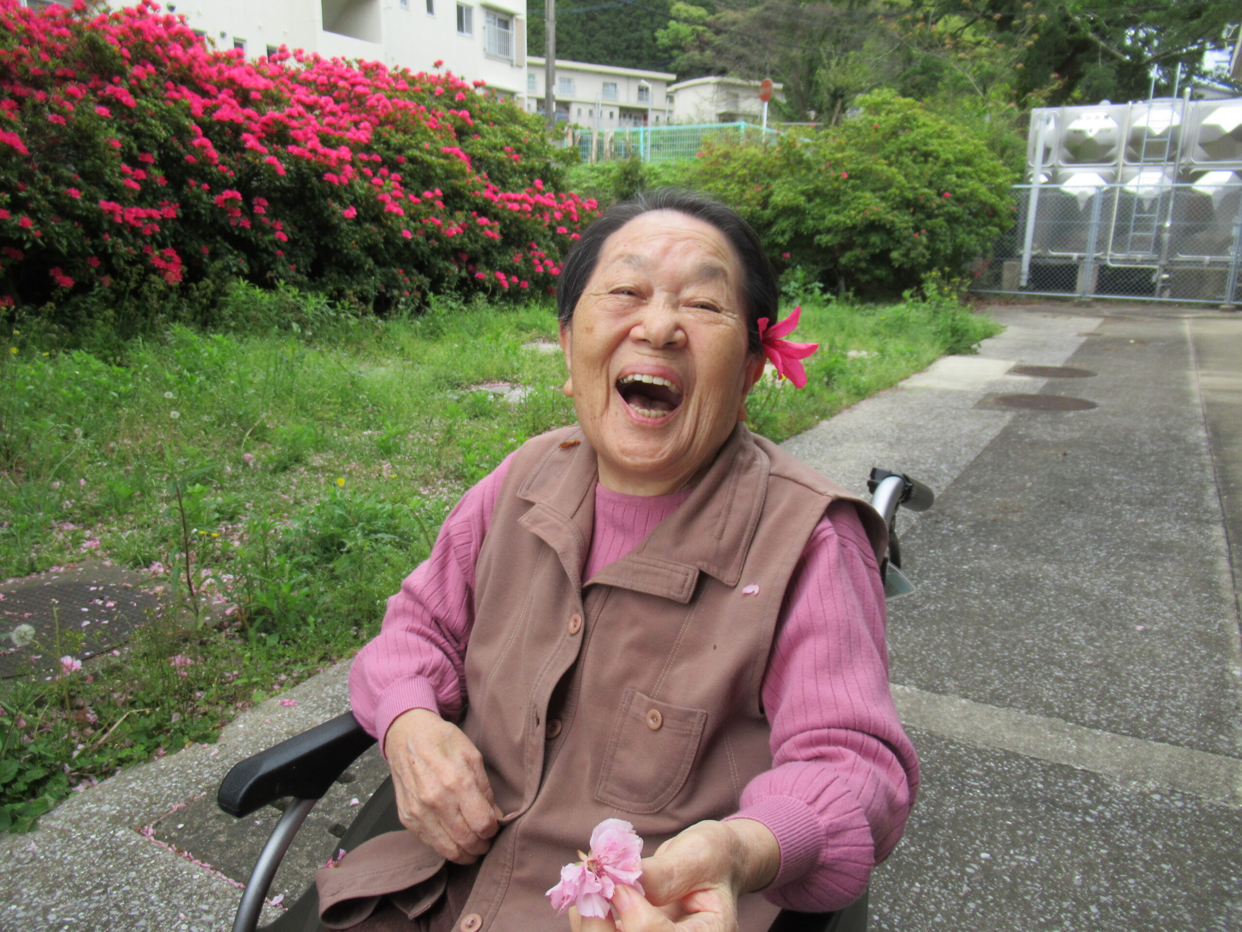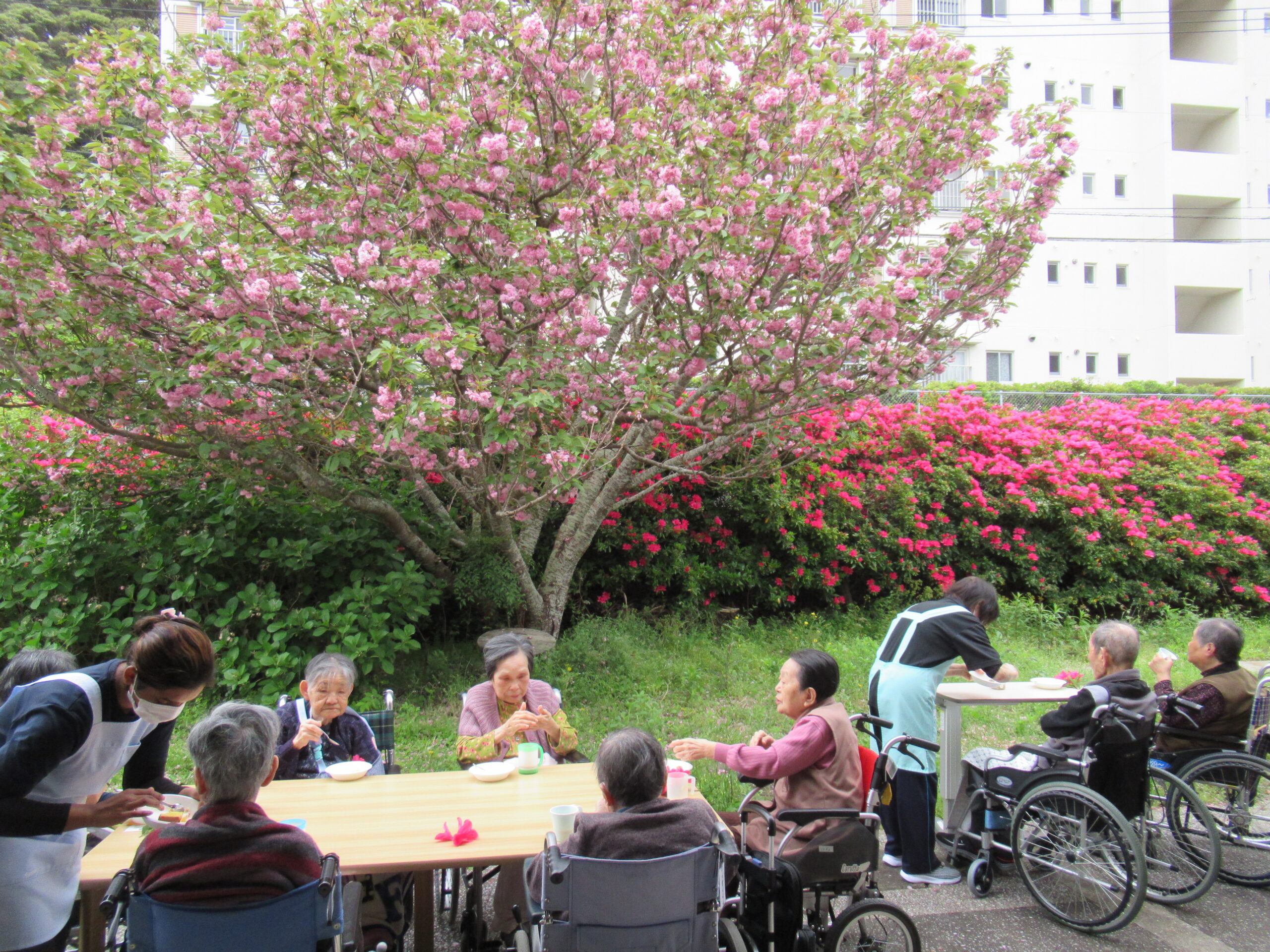 施設中庭にて 八重桜&ツツジの お花見会をいたしました❀