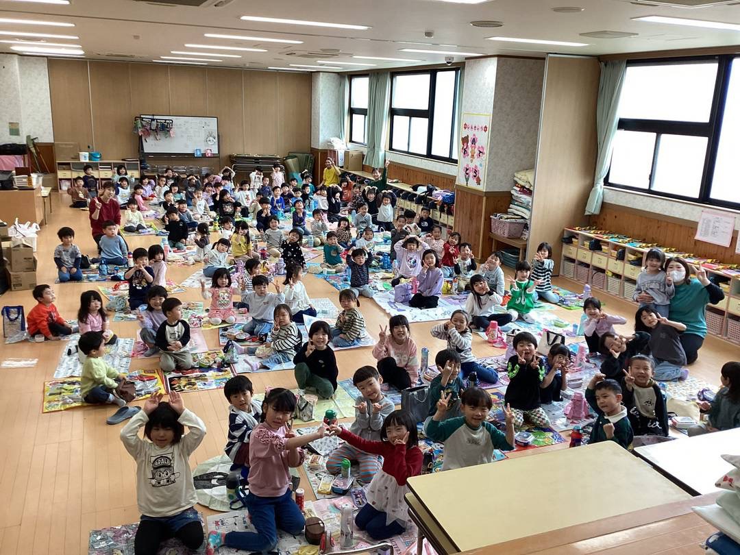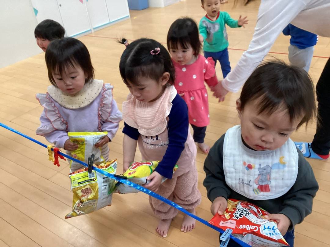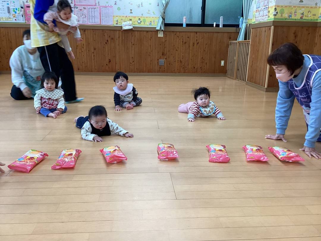 未満児クラスの、園でのお菓子取り競争の様子をご覧ください。