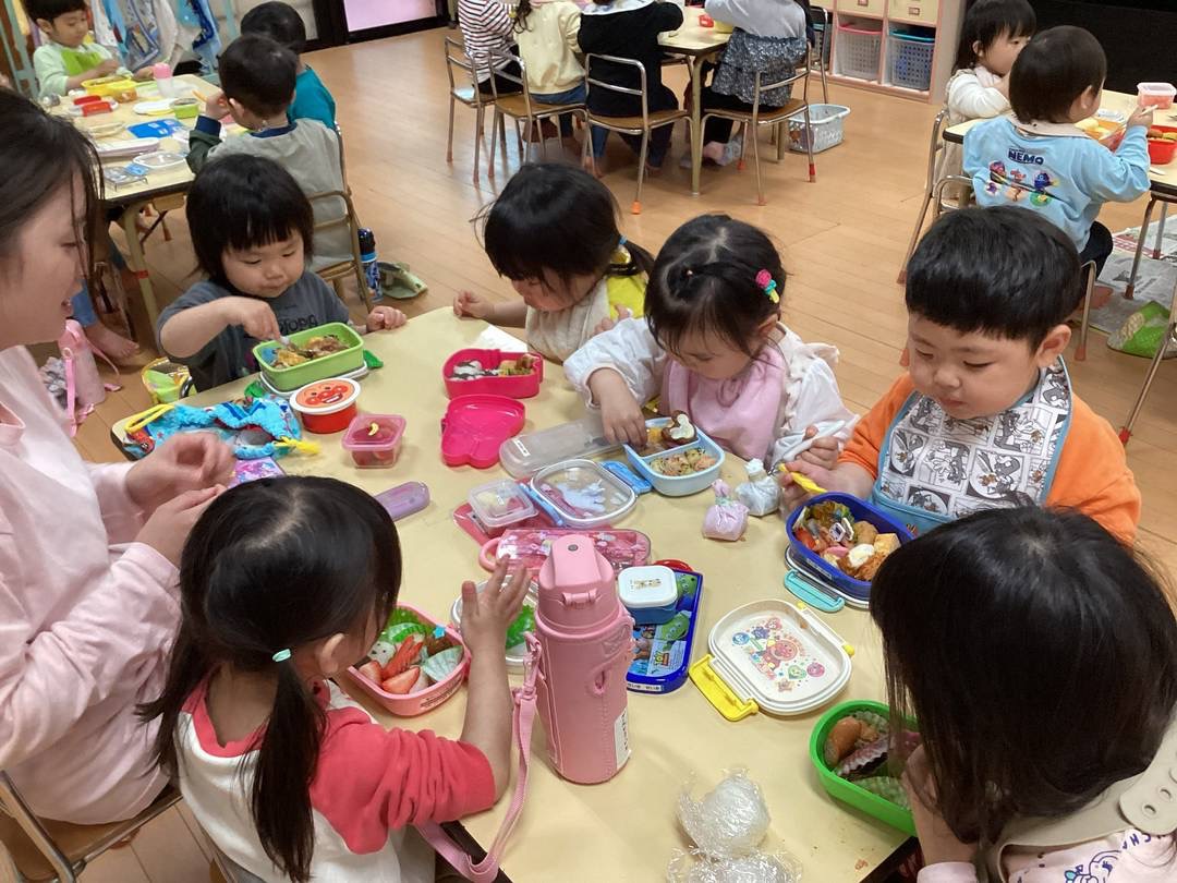 帰ってきてからのお弁当になりましたが、以上児のお弁当の様子です。