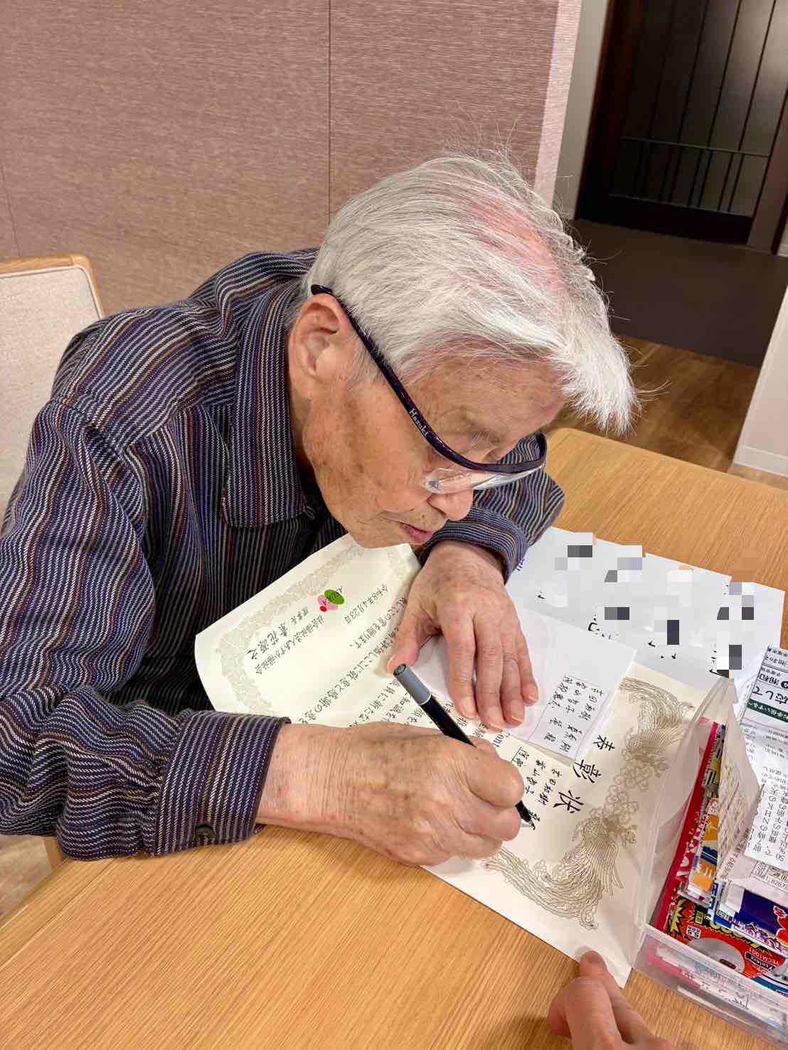 賞状には参加職員の名前がなかったため、字の上手な利用者様にお名前を書いていただき