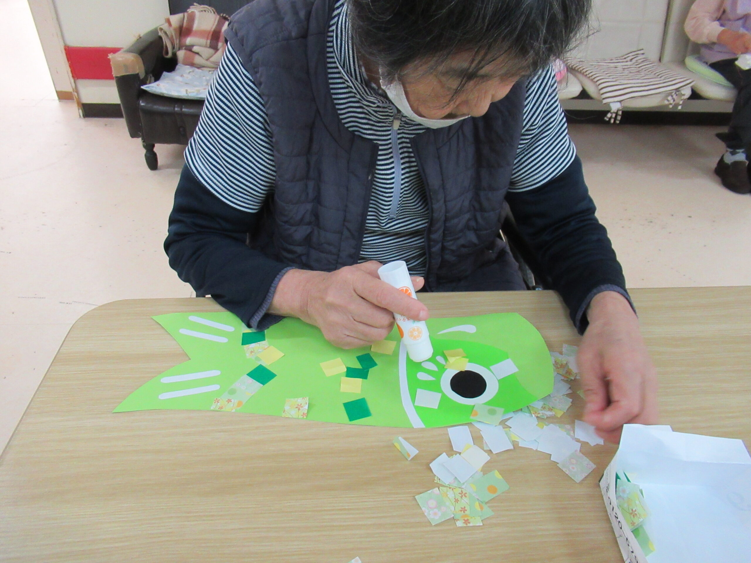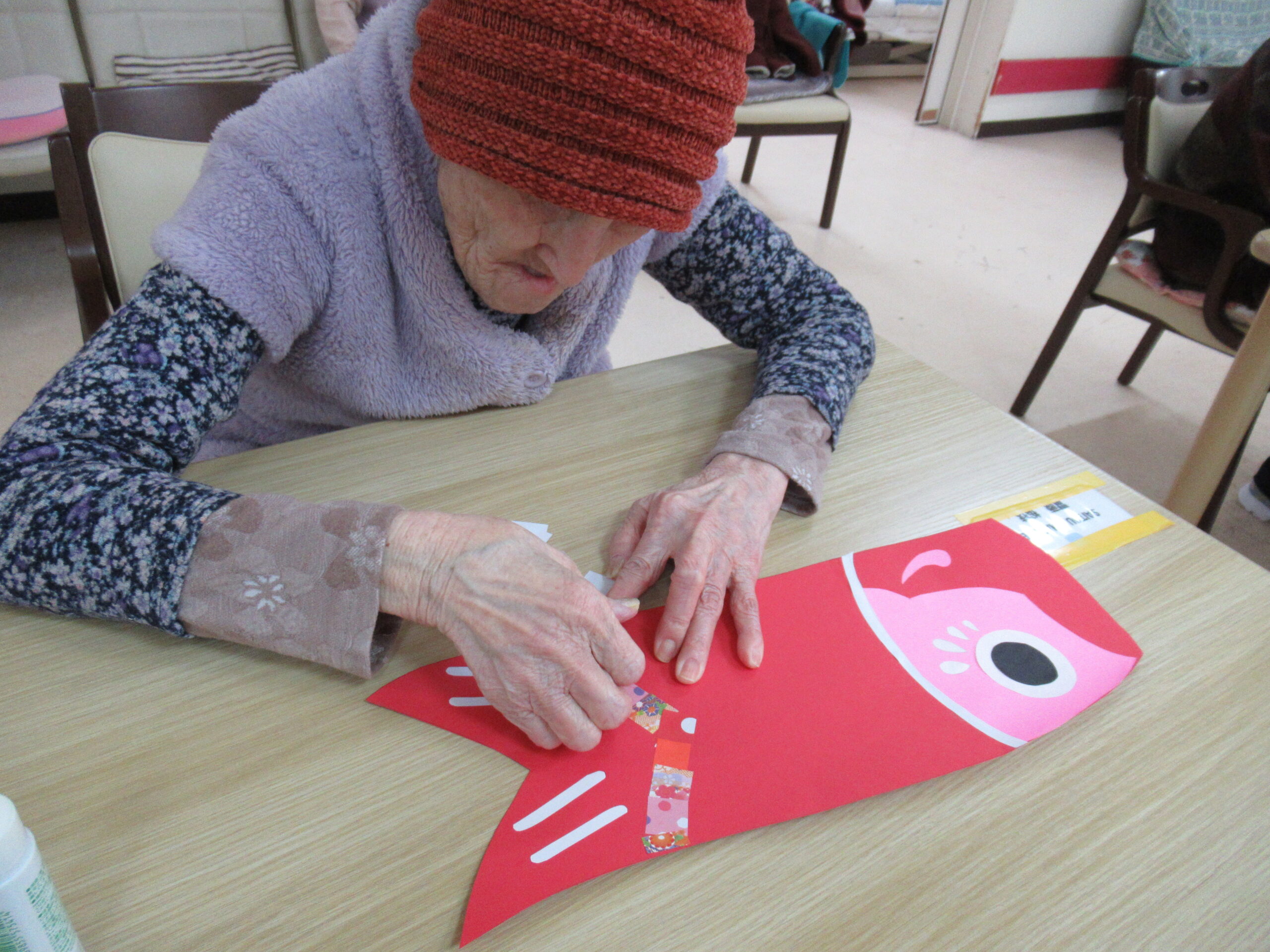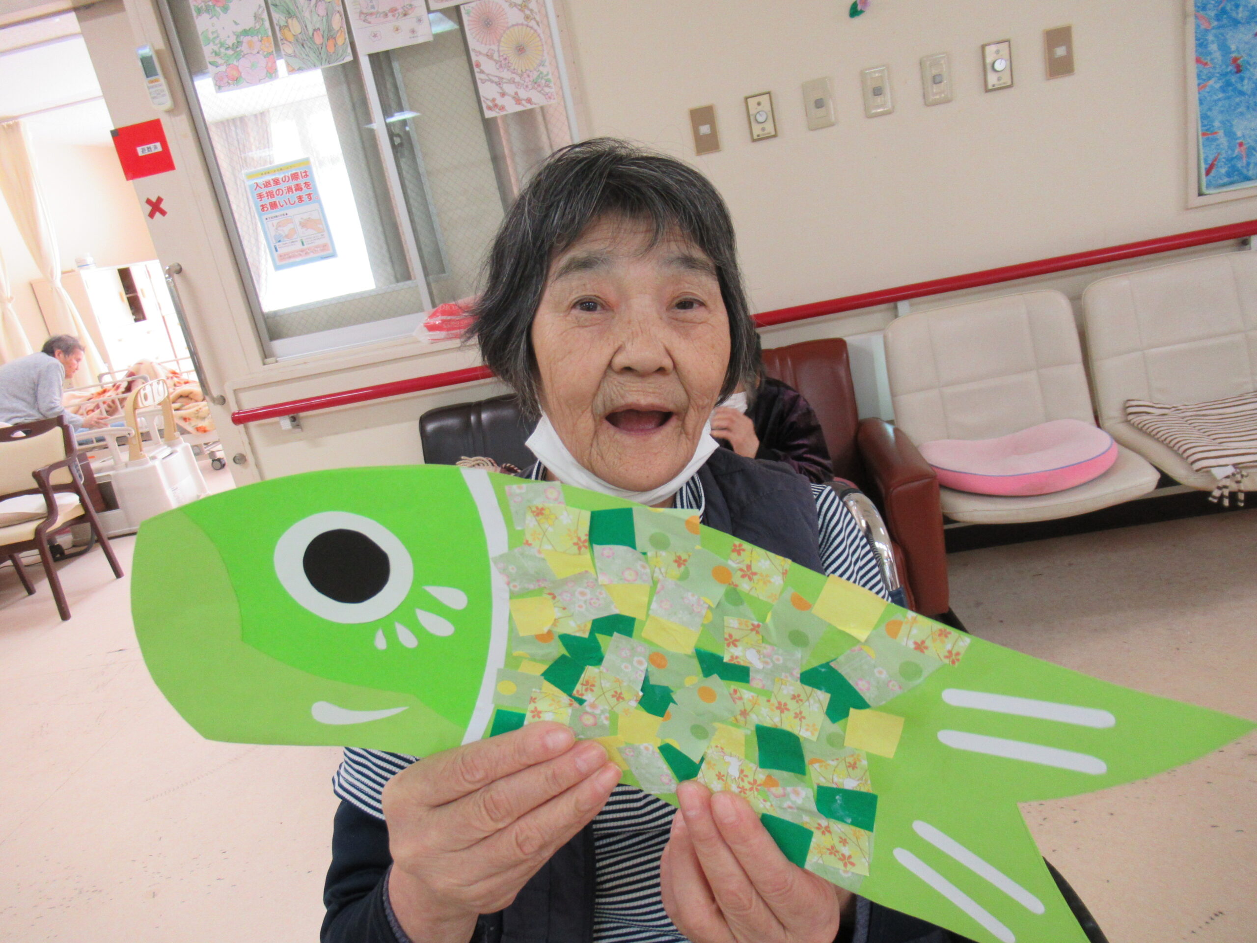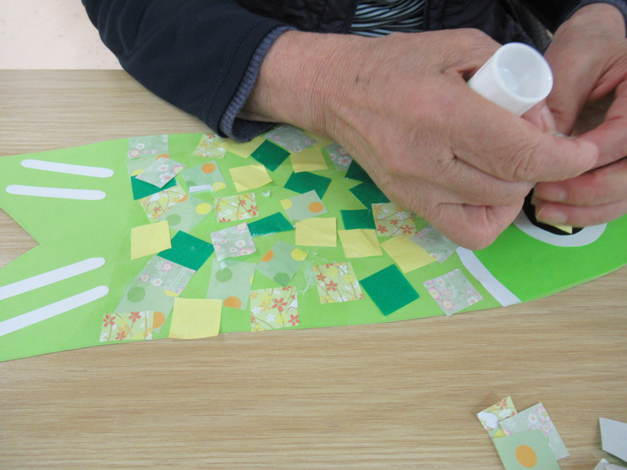 貼り絵班の皆さんには 鯉のぼりのうろこをペタペタと貼ってもらいました!