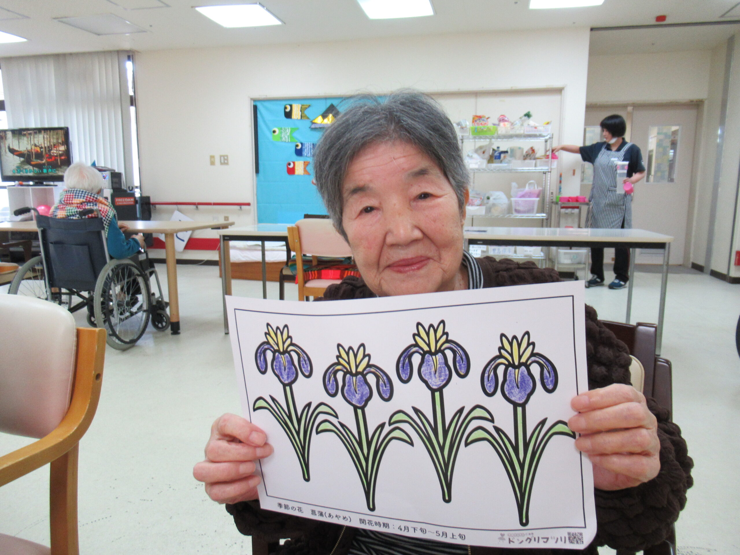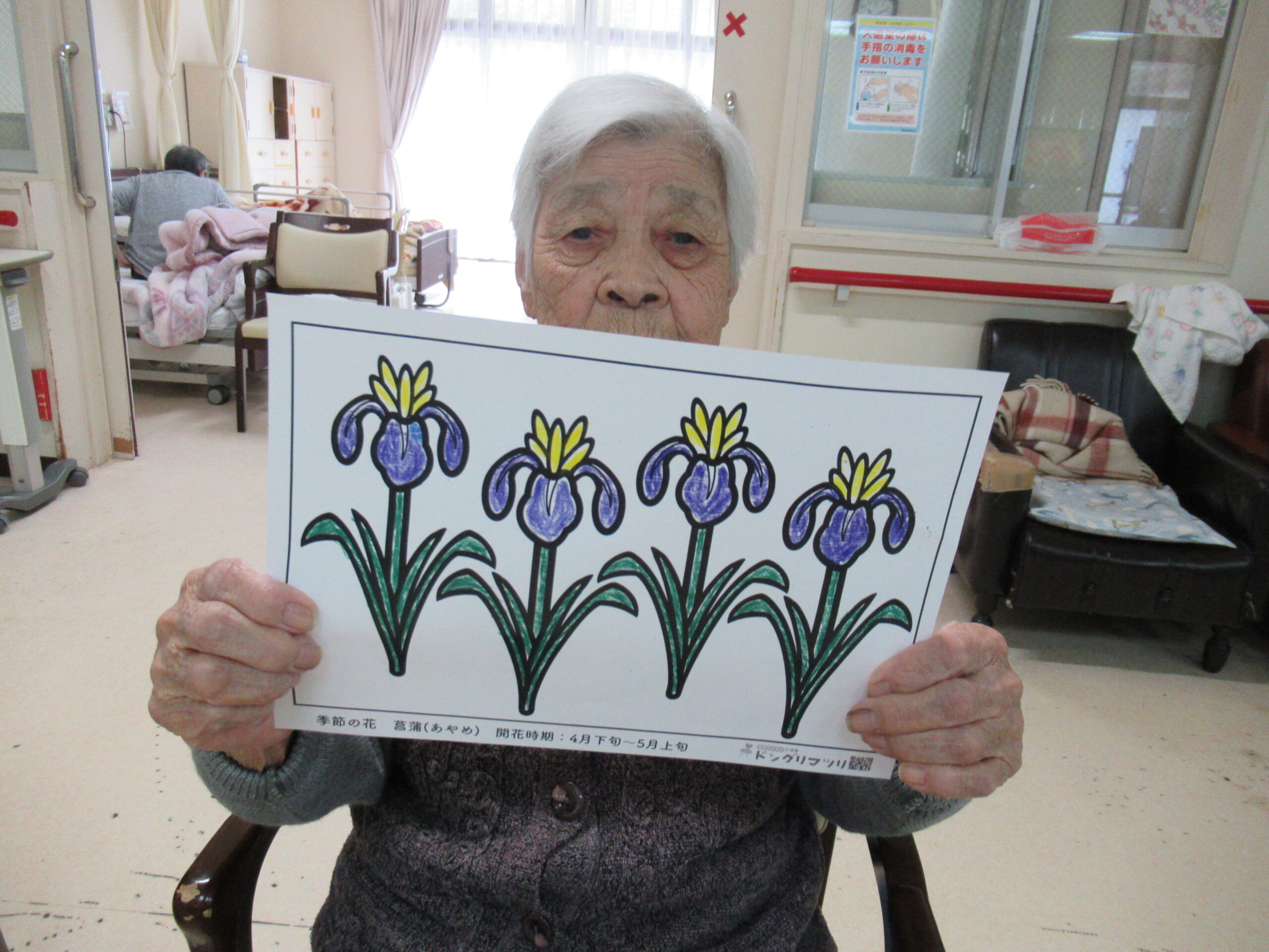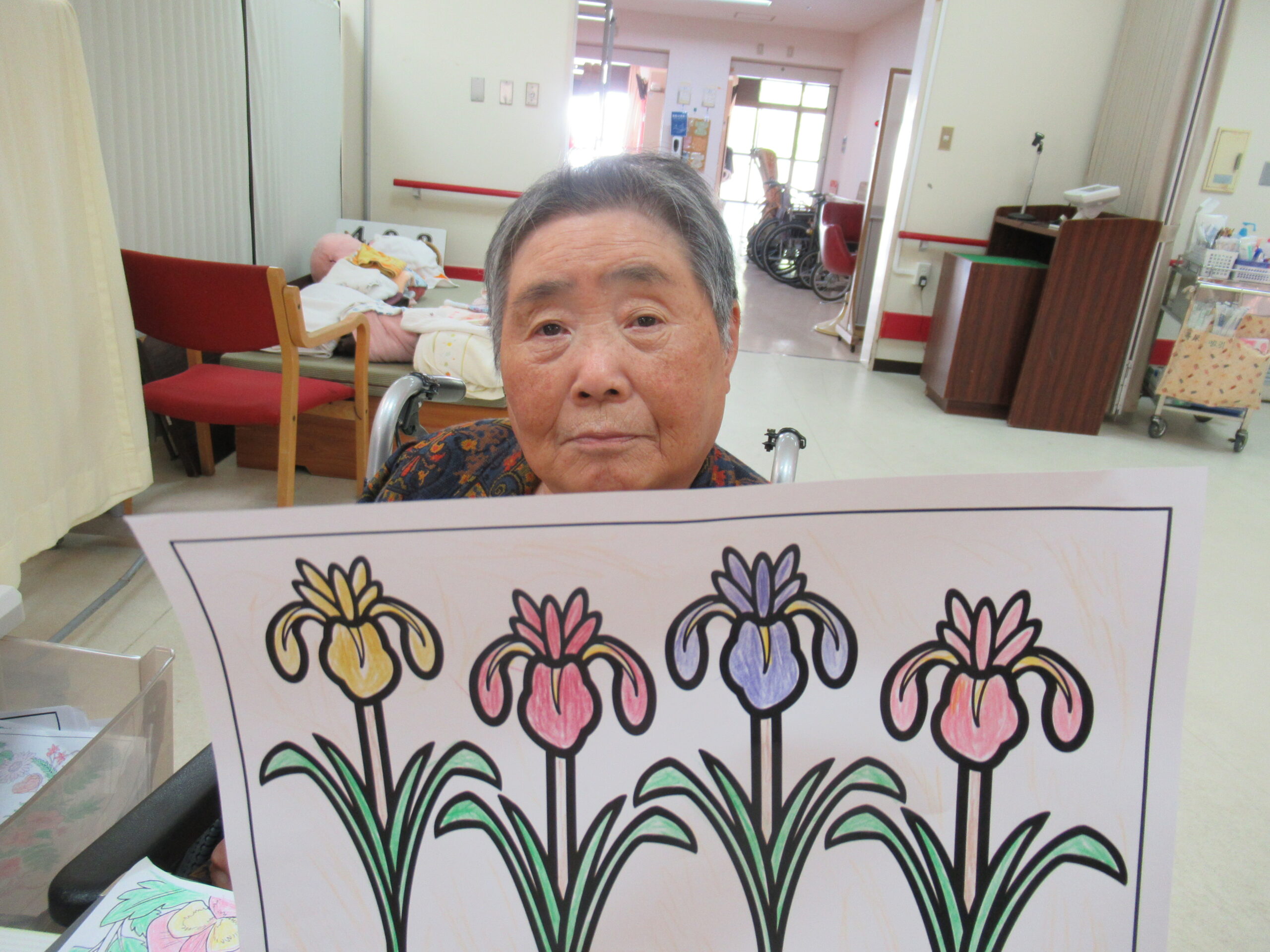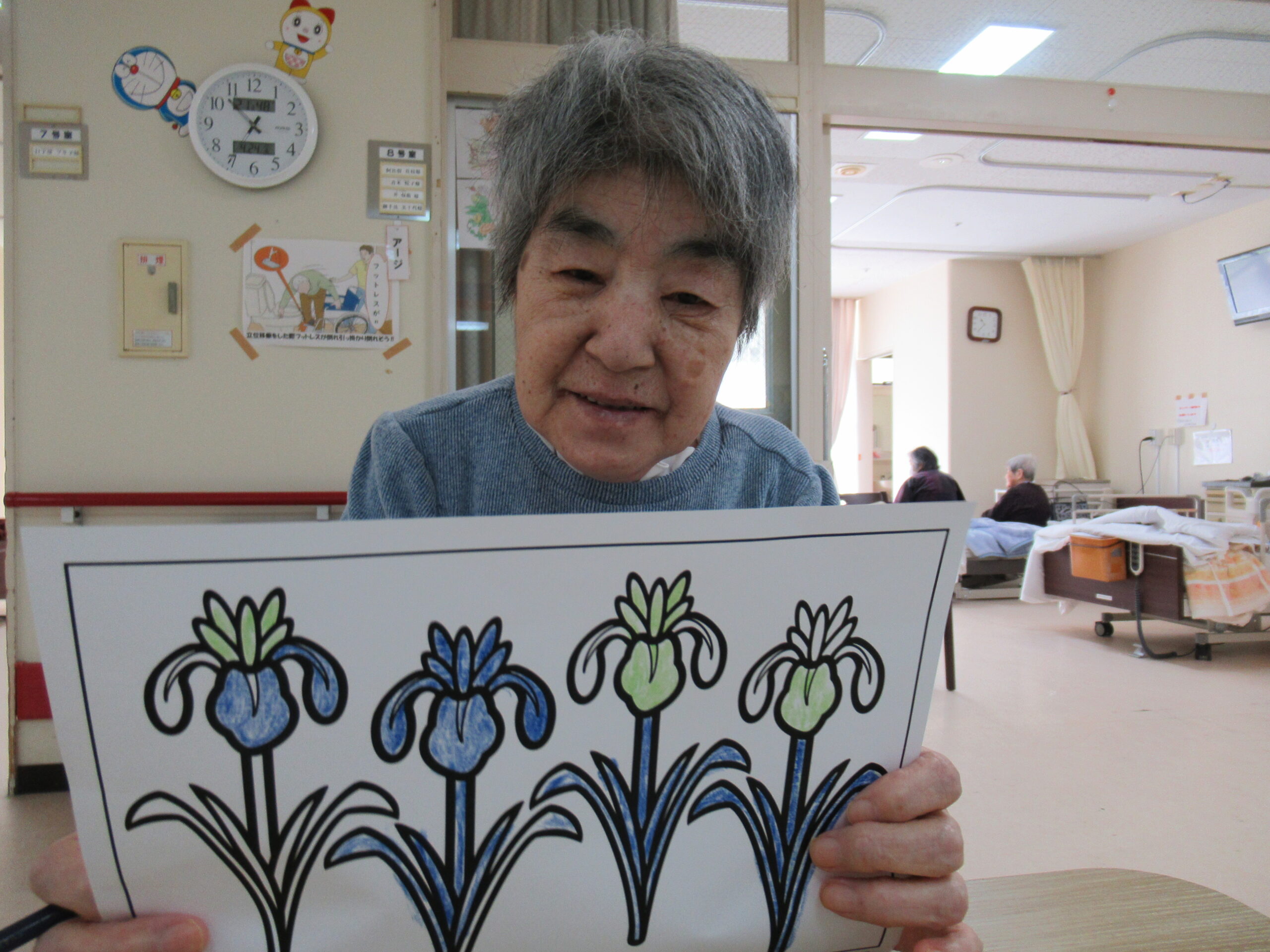 お次は 塗り絵班。菖蒲の花に色をつけてもらいました!