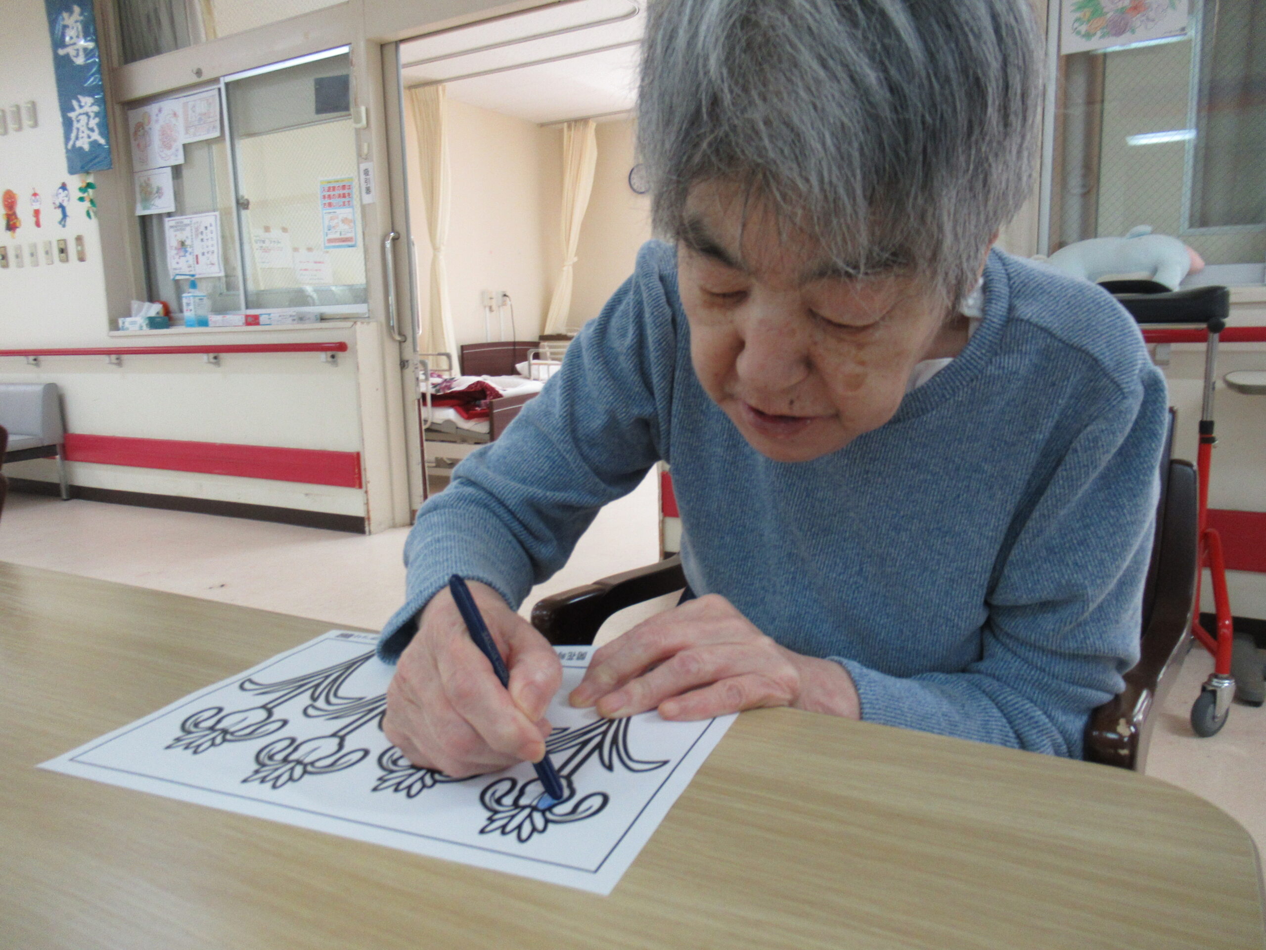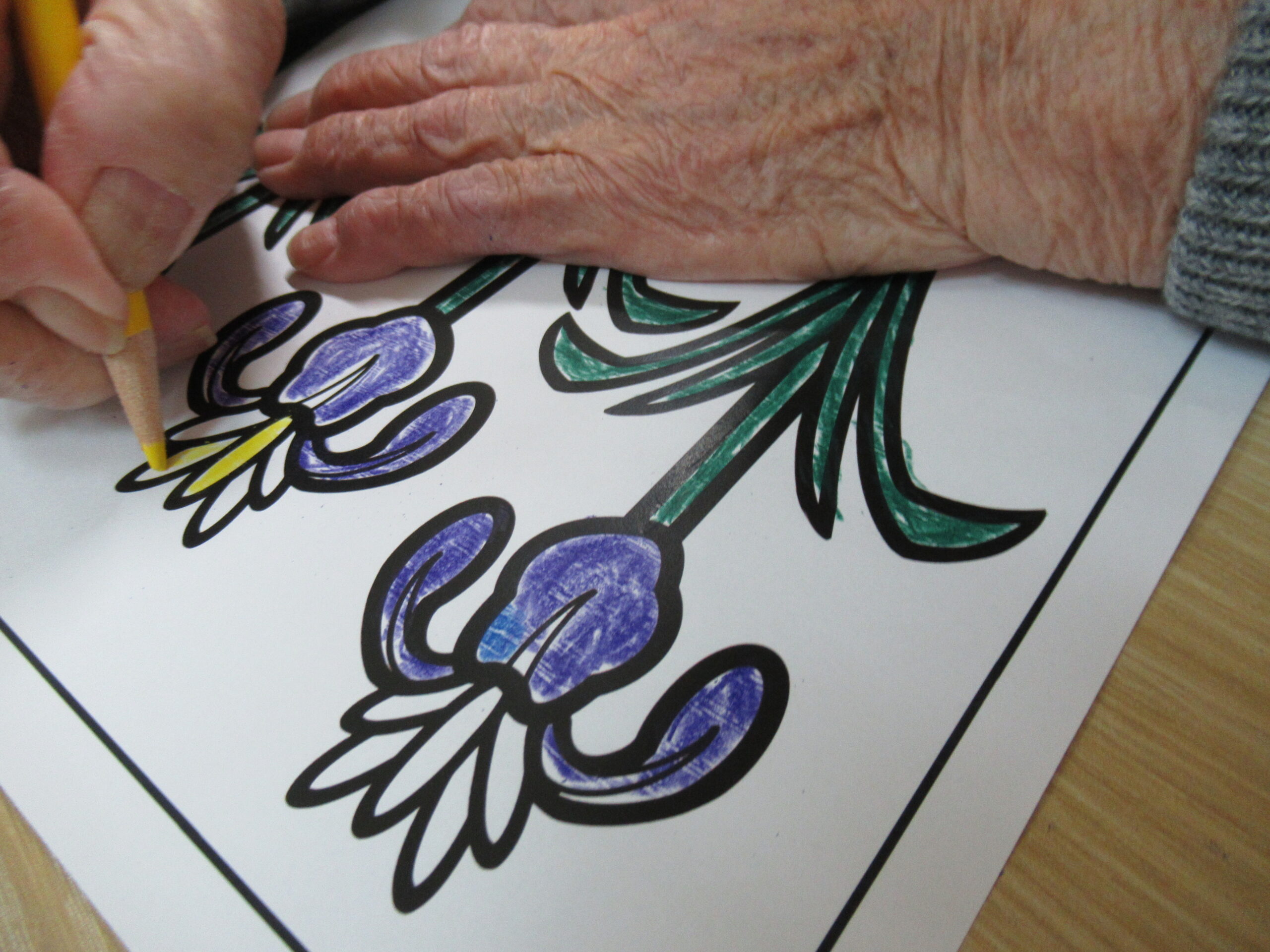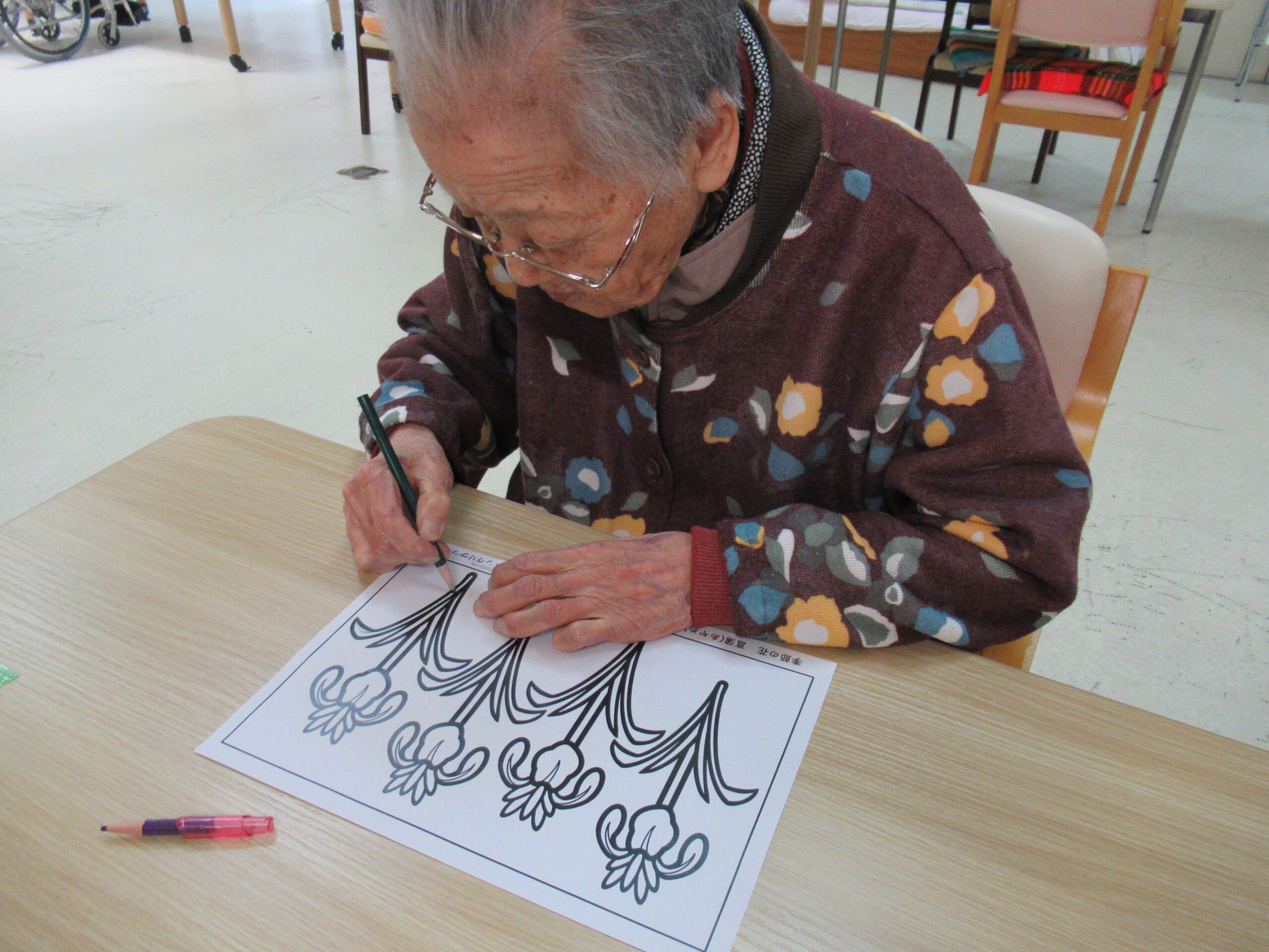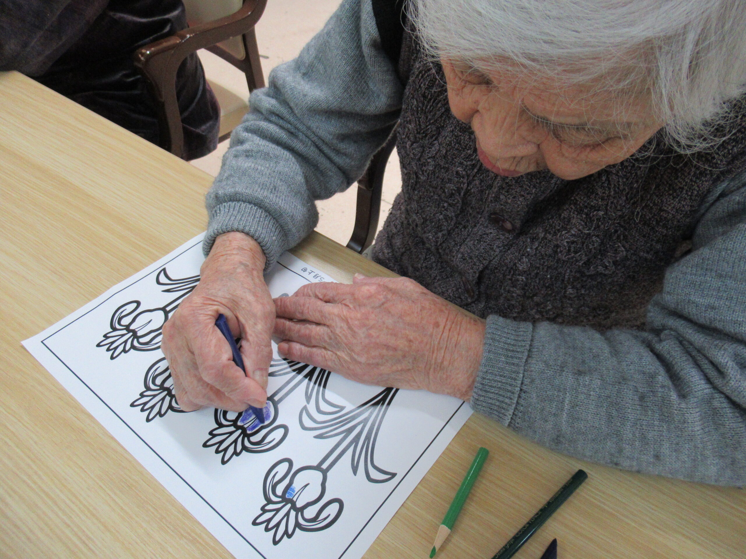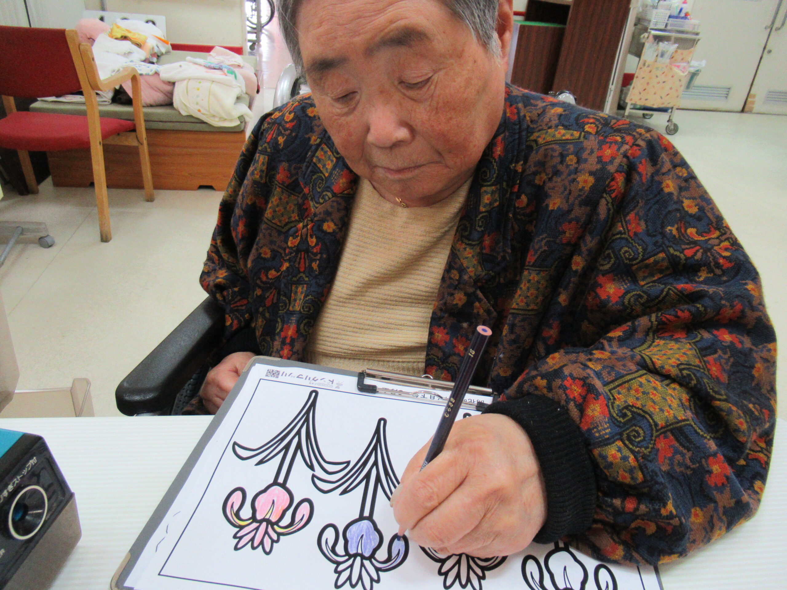 お次は 塗り絵班。菖蒲の花に色をつけてもらいました!
