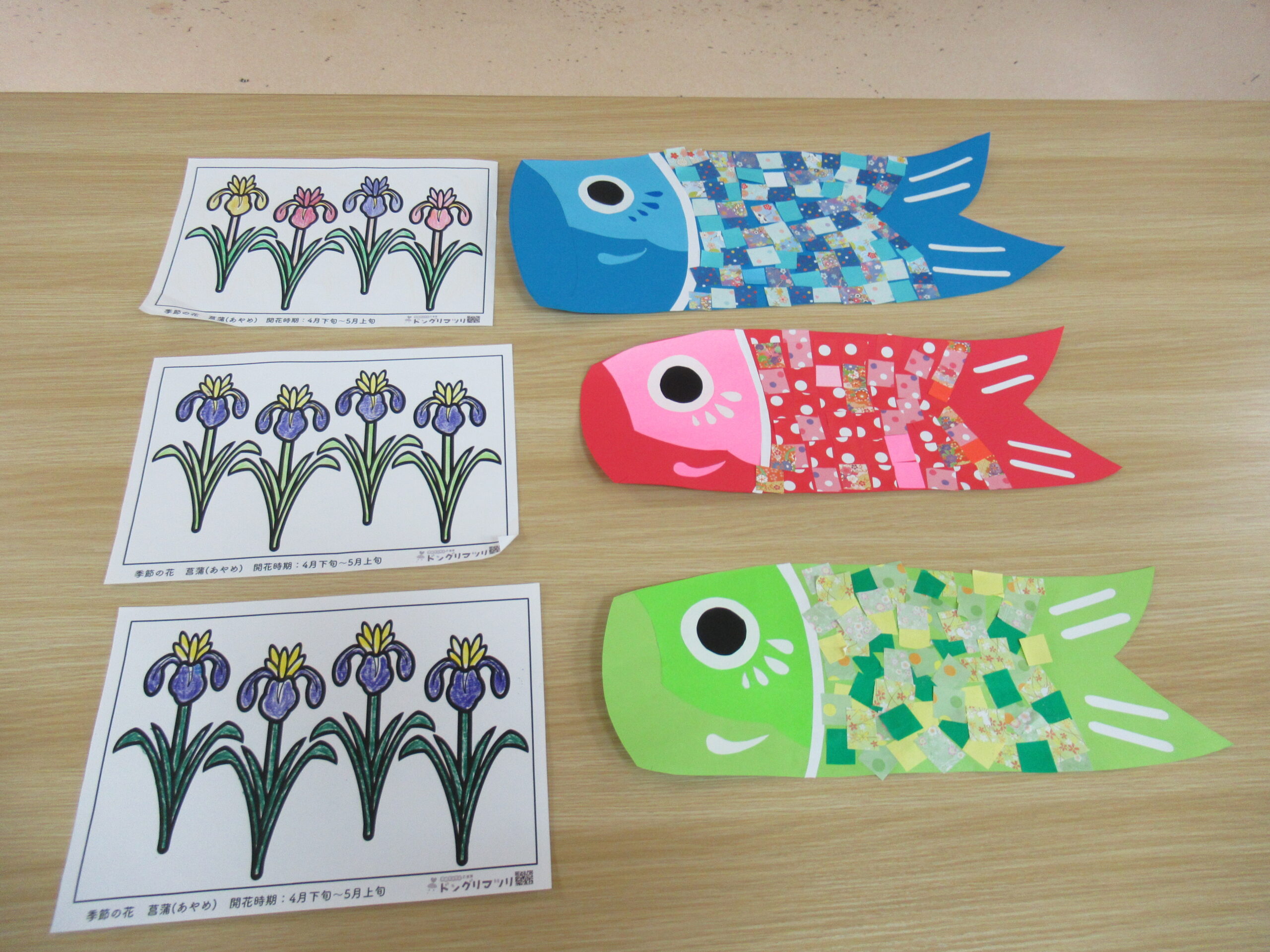 出来上がった 鯉のぼりと菖蒲は 施設玄関に飾り付けたいと思います☺