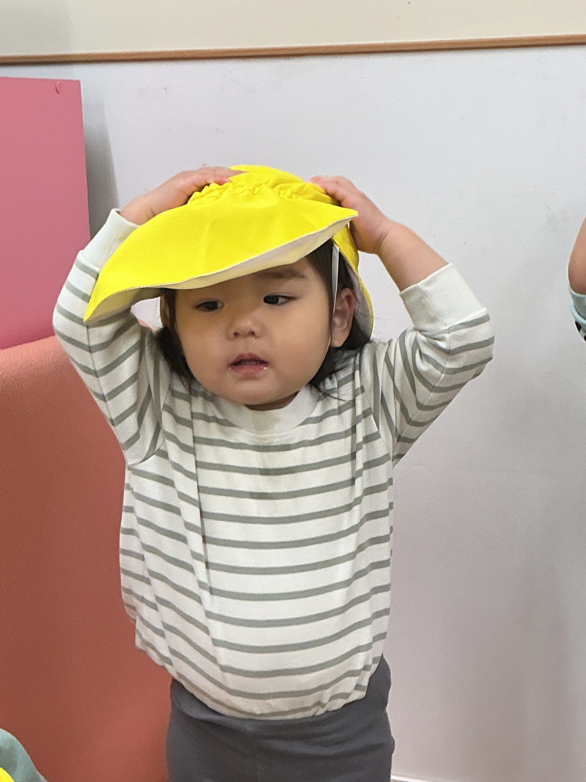 新しい黄色い帽子を自分で被ってみよう!と頑張っています!