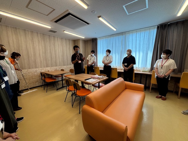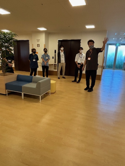 温雅荘の朝礼に参加させていただき、体操ですっきりした後、温雅荘 植村副施設長が施設内の見学案内をしてくださいました。